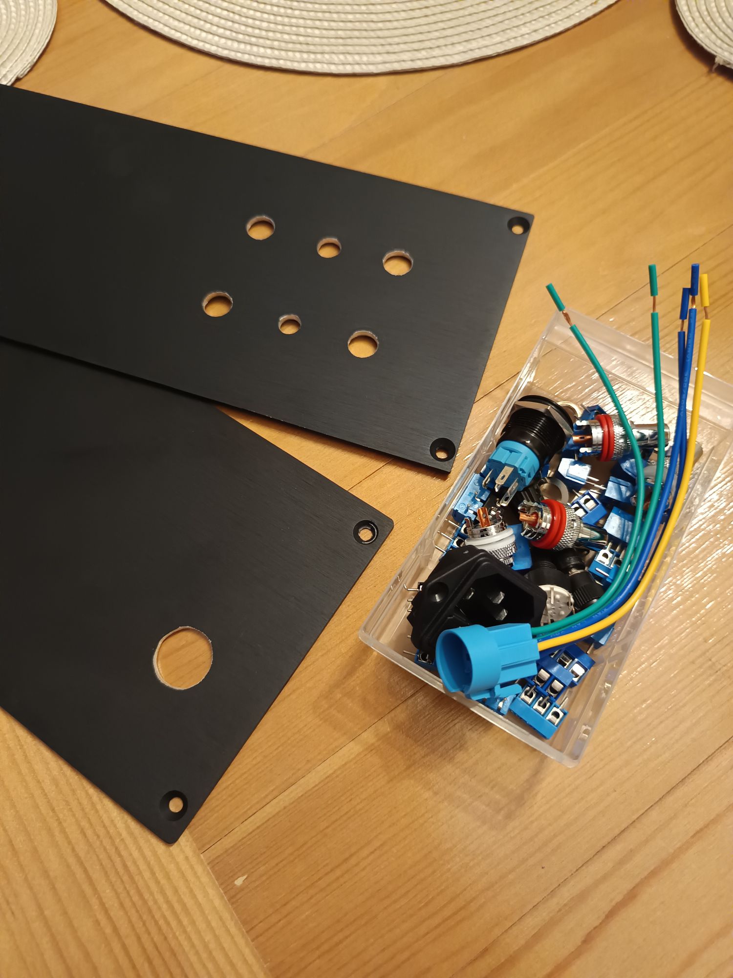 Obudowa z Modusa przyjechała z wyciętym otworem IEC, resztę wywierciłem, RCA 11mm wiertłem do stali że wstępnym nawiertem 3mm. Pod guzik 19mm, wstępnie 3mm, reszta stopniowym do 18mm i poprawka pilnikiem