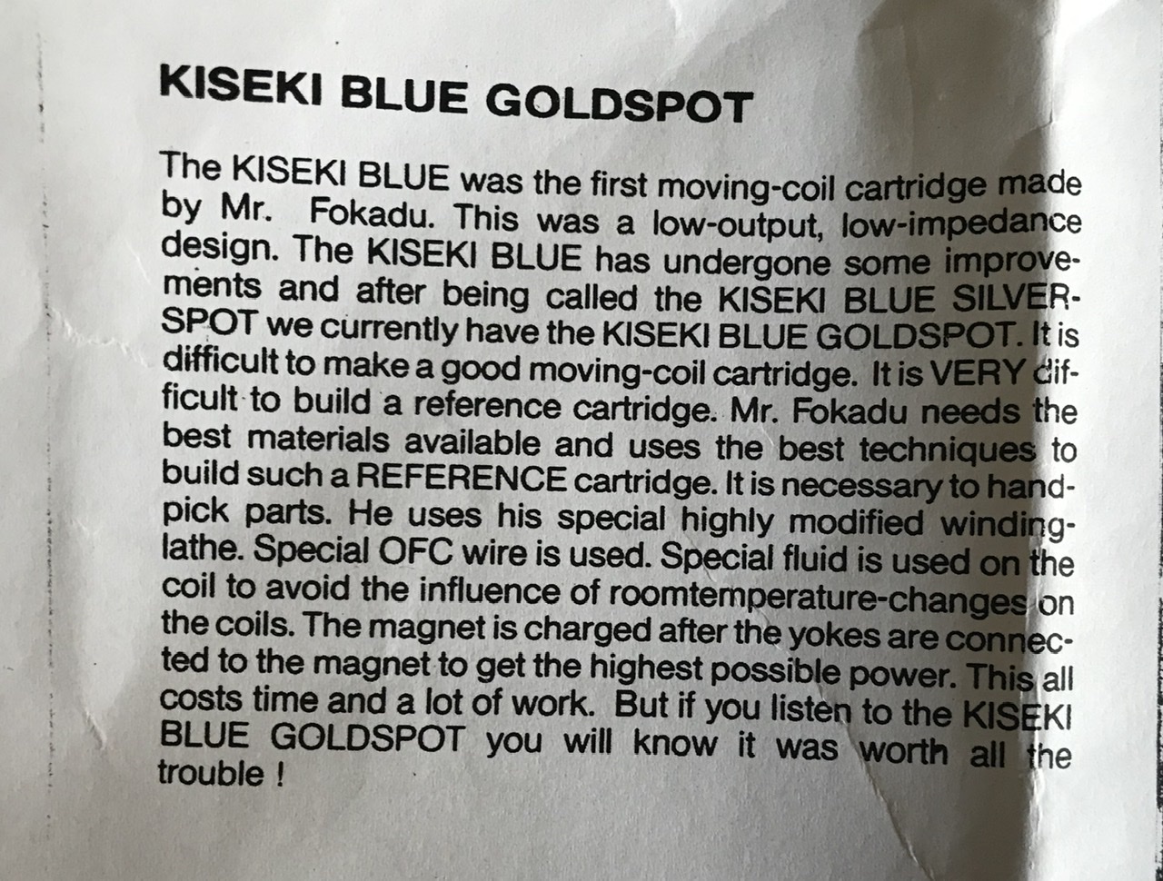 Z tego co wyczytałem wszystko zaczęło się od Holendra Hermana Van den Dungen, który był w Europie dystrybutorem wkładek Koetsu robionych przez Yoshiaki Sugano (niezły koleżka swoją drogą ten Sugano: bokser, artysta, twórca mieczy samurajskich i manager w korporacji samochodowej) . Herman Vd Dungen stworzył też m.in. markę wzmacniaczy lampowych Prima Luna (https://www.primaluna-usa.com/). Dystrybucja Koetsu szła dobrze do czasu aż V.d. Dungen przestał dostawać terminowo wkładki za które z góry płacił. Zauważył też że jakość wkładek Koetsu nie jest stała i powtarzalna. Nieporozumienia z Sugano narastały. W końcu stracił dystrybucję. Chcąc utrzymać rynkową pozycję (a może i się zemścić) stworzył markę Kiseki (jap. cud). Zaprojektował zatem body i wysłał do Japonii. Wkładki budował dla niego Goro Fukada (w instrukcji jest napisane, że Fokadu bo tak nazwał go V.d. Dungen by zapewnić konstruktorowi trochę anonimowości) . Kiseki szybko zagroziło Koetsu i zyskało grono fanów. W złotych czasach ( nie mówimy o obecnych wkładkach New Old Style) wypuścili modele: