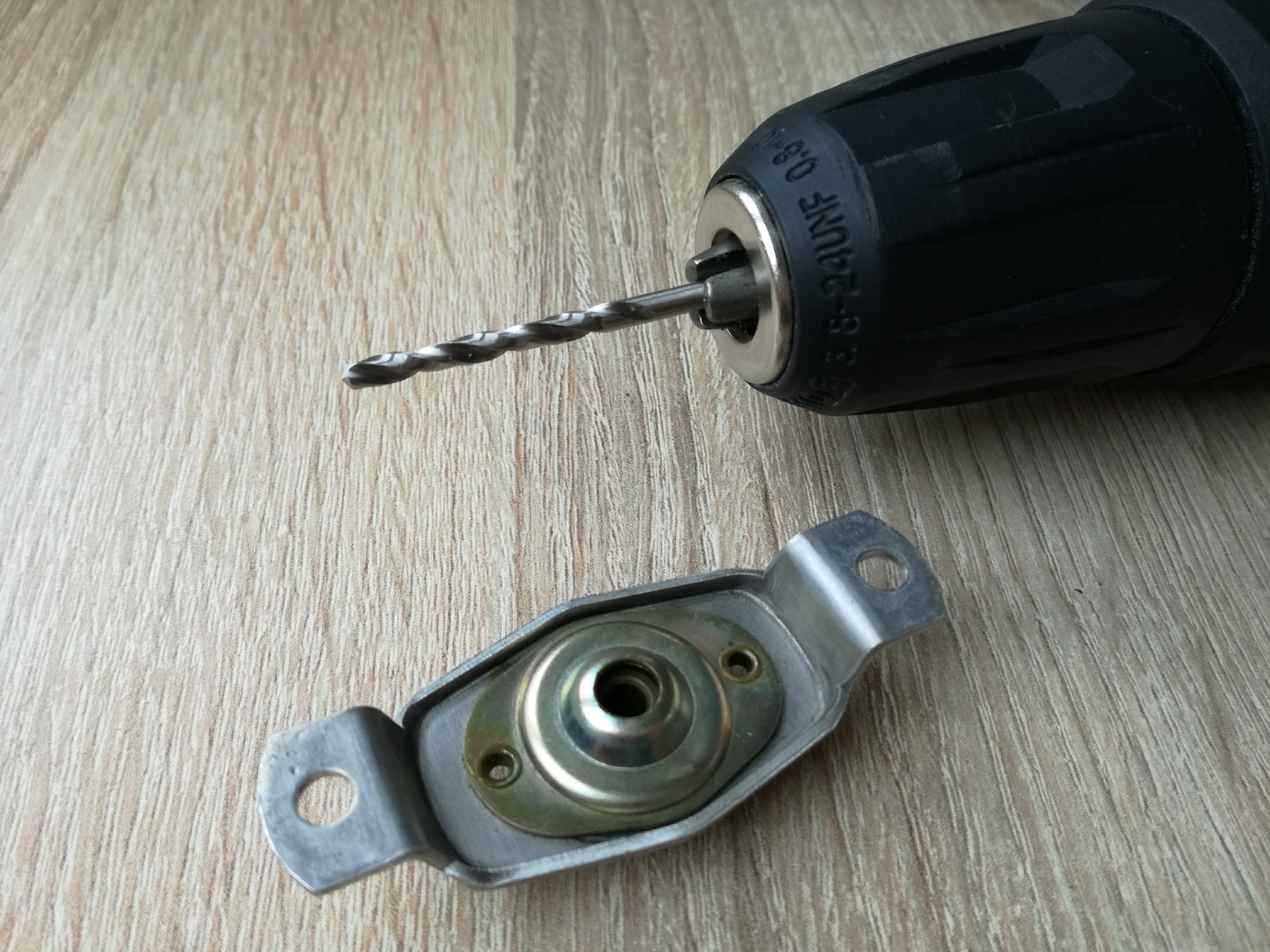 Dolne łożysko. Otwieramy. Wiertło 3mm i przewiercam 2 fabryczne nity, żeby się dostać do środka: