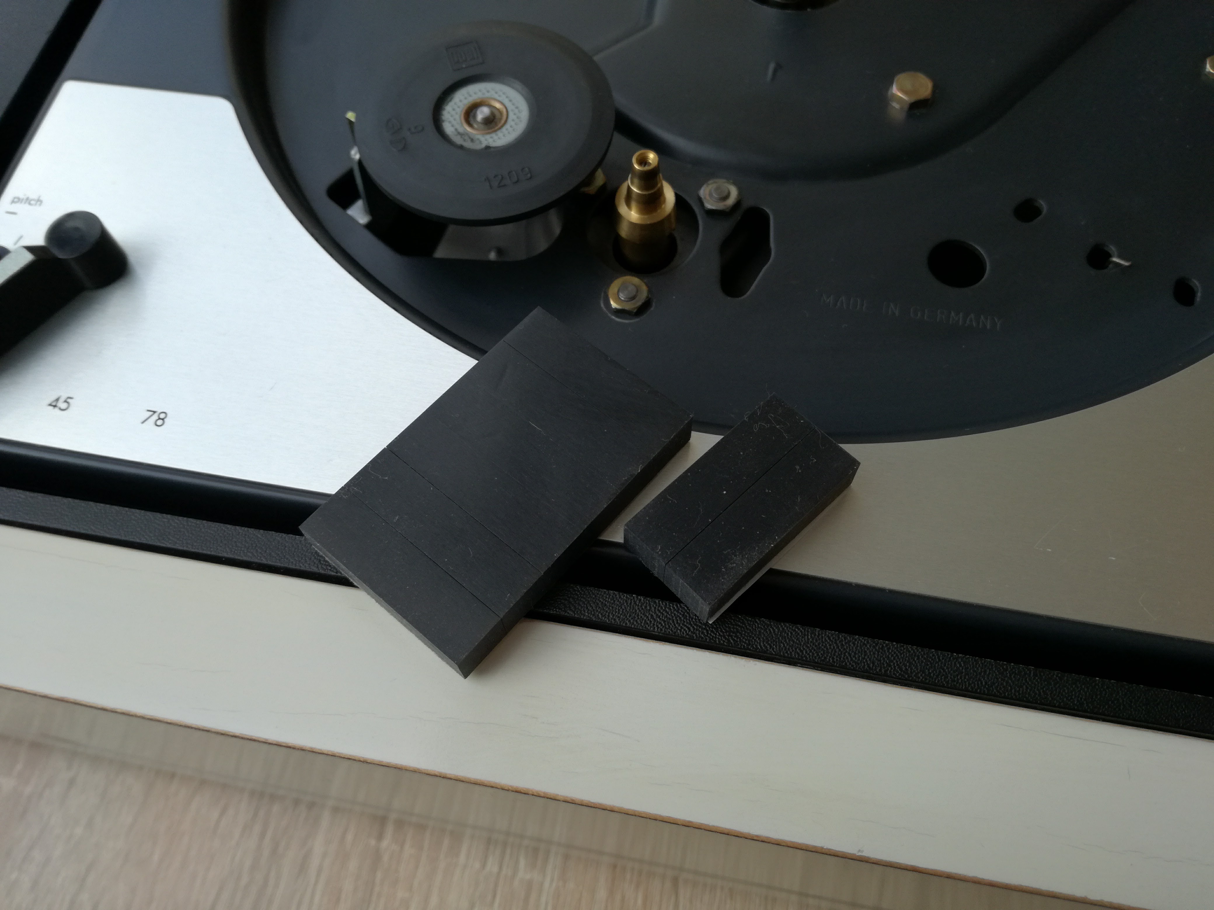 W sumie u mnie już ostatki. Ostatnie dni to głównie regulacja. Skasowałem luzy na ramieniu. Tak w ramach ciekawości to Dual zaleca minimalny, wyczywalny luz na ramieniu. Wymieniłem okablowanie. Kabel Sommera + wtyki Neutrik Rean. Osobno kabel uziemiający. Zastanawiam się jeszcze nad Amphenolami. Musiałem podregulować obroty bo nie dało rady poprawnie ustawić po zabiegach z łożyskiem silnika. Na pozostałości po jakimś filcu założyłem gumowe nóżki. Co prawda to opcja budżetowa ale zawsze trochę wytłumi drgania