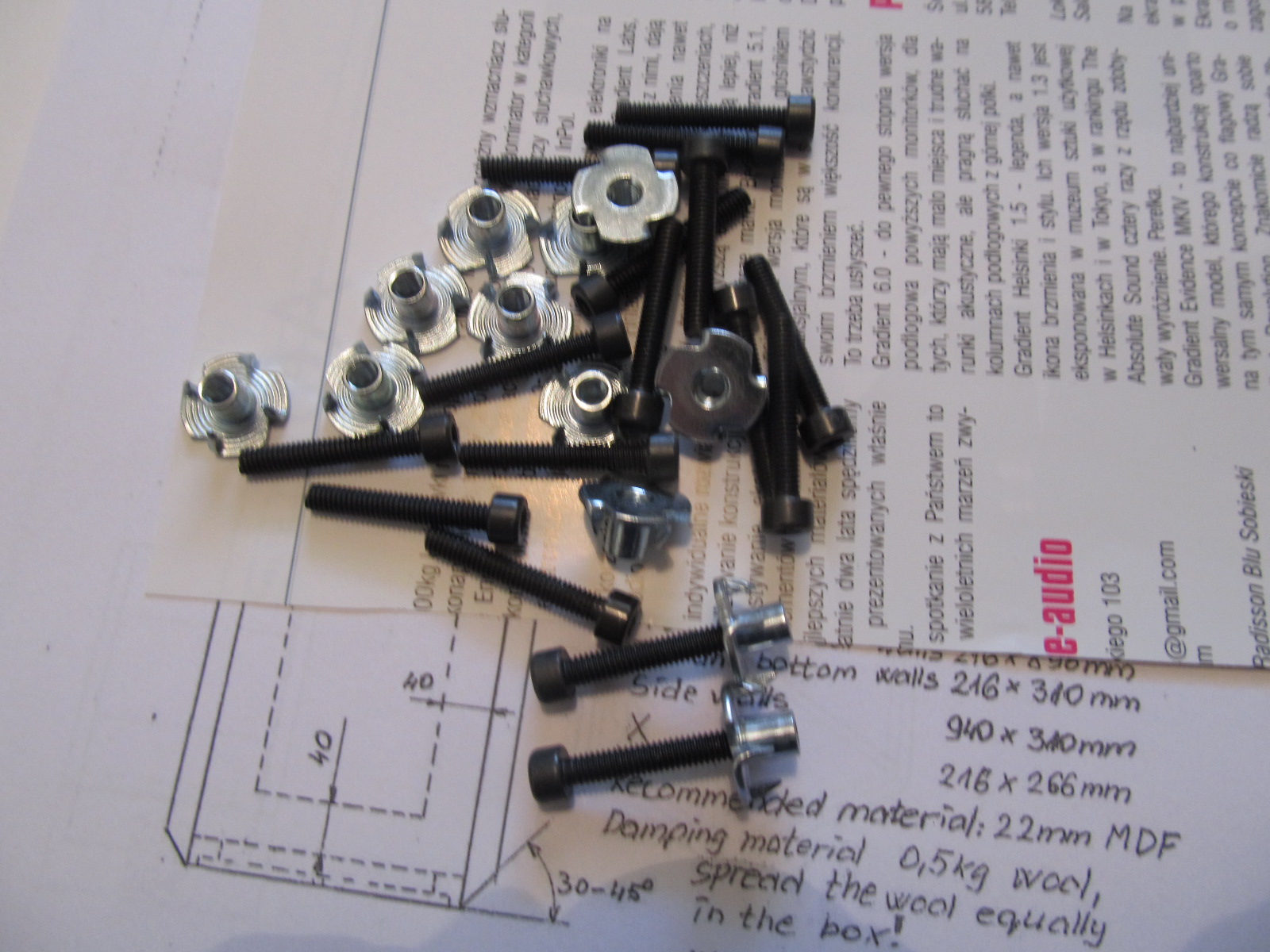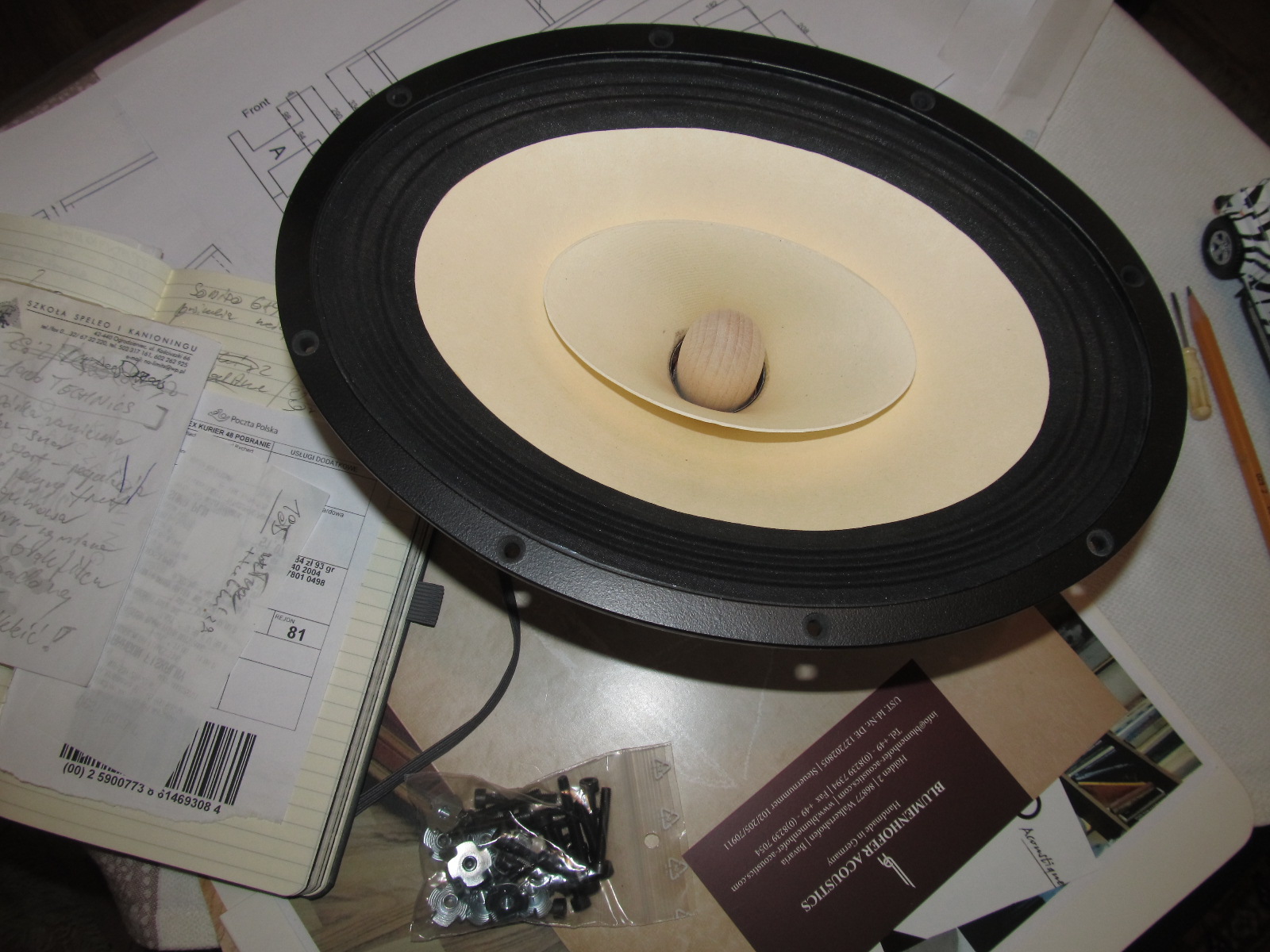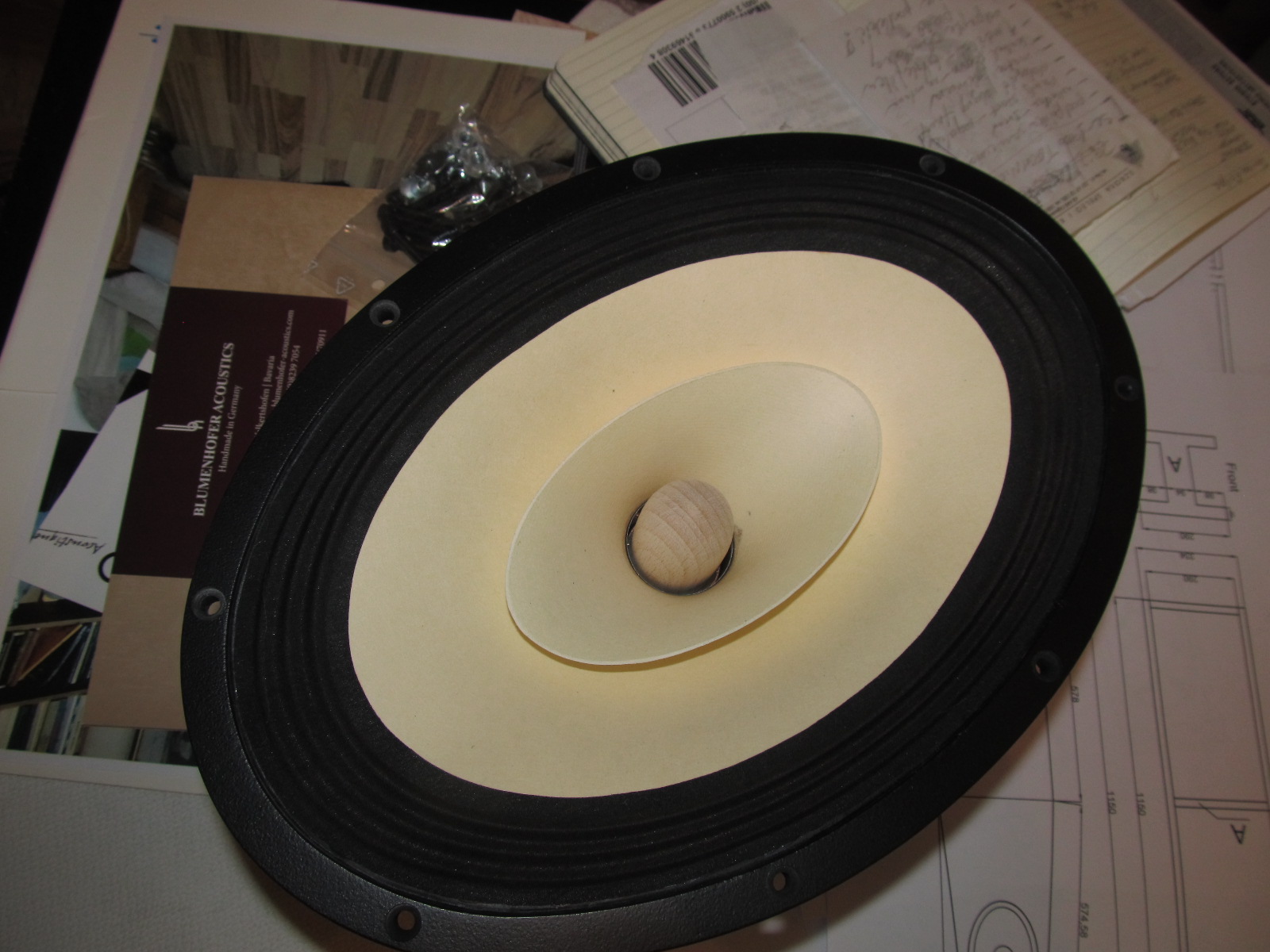 Ha, przyszły głośniki. są piękne i .. duże. Potężny magnes Alnico, parowane z wydrukiem parametrów i wykresami pracy. W międzyczasie Istvan dosłał mi jeszcze jeden, najnowszy projekt dla obudowy o tej samej pojemności, a innych bardziej podstawkowych kubaturach i pochylonym panelu osadzenia głośnika. Interesujące. Odkładam na zaś i raczej pod inne głośniki ze stajni Sonido.