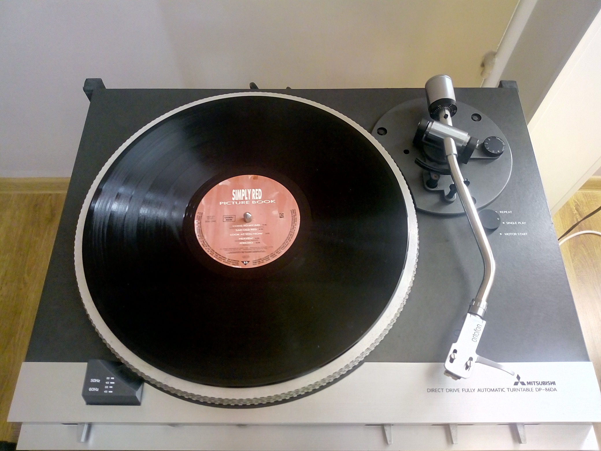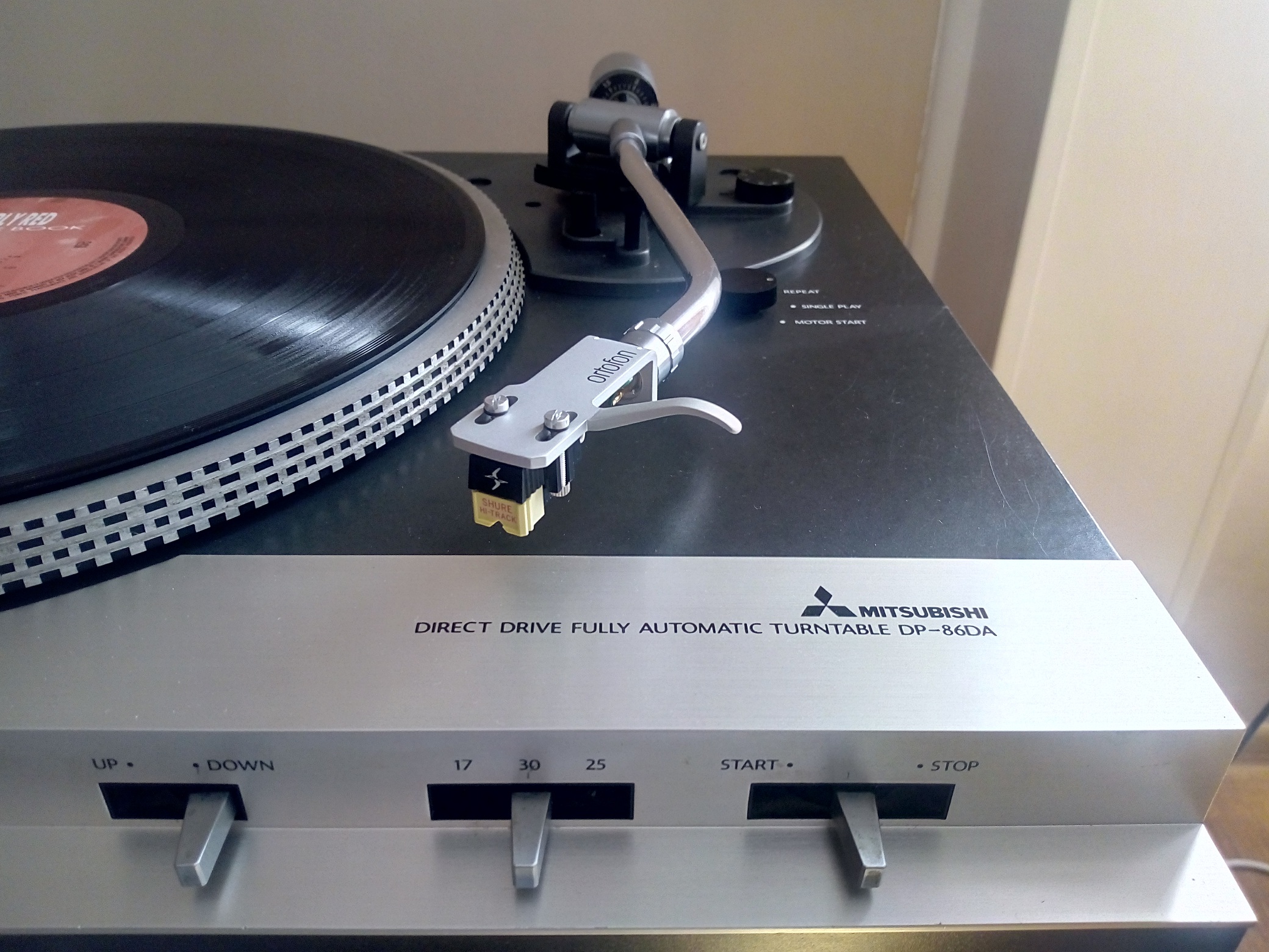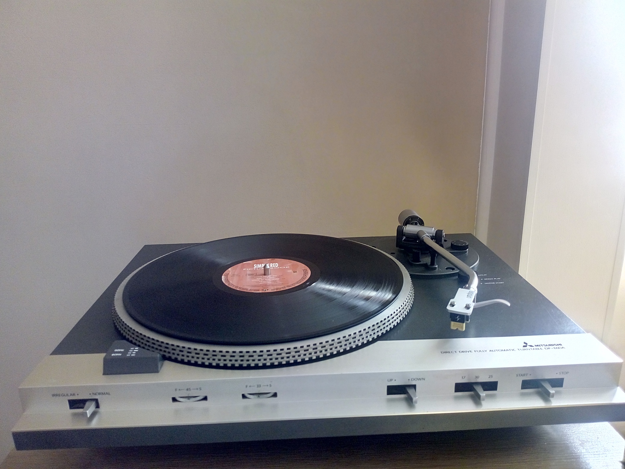 Najnowszy nabytek -Mitsubishi DP 86 DA.Wylicytowany na allegro,miał nie grać na prawym kanale.Po wymianie na inna wkładkę z dobrą igłą ,gra na oba kanały b.dobrze.Gramofon sprawny technicznie,wszystkie funkcje działają prawidłowo,ba nawet winda działa tak jak należy,ramię powolutku opada na płytę.Regulacji wymagało jedynie ramię ,gdyż za wcześnie podnosiło się na końcu płyty.Jeden z cięższych gramofonów jakie miałem,solidna plinta(nie plastikowa!),wykonana chyba ze sklejki.Obroty stabilne.Pokrywa do wymiany,bo ta obecna jest jakby przypalona w niektórych miejscach i nawet wypolerowanie jej nie przyniesie pożądanego efektu.