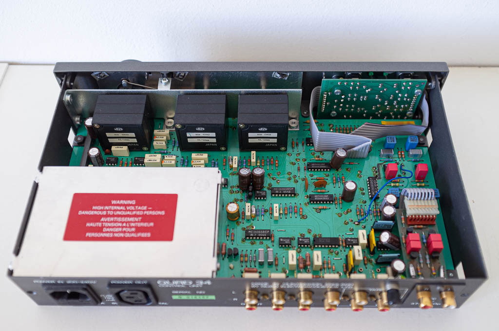 W końcówce wymienione elektrolity na płytkach (Nichicon), wstawione opampy OPA604 na podstawkach precyzyjnych, wymienione trafo na nowe trafo toroidalne 350VA w wykonaniu audio z Toroidy.pl (Wszystkie oryginalne trafa w starych Quadach 405 brzęczą i wymagają wymiany), wstawiony porządny układ opóźnionego załączania głośników. Zmniejszona czułość wejścia z 500mV na 1,5V.