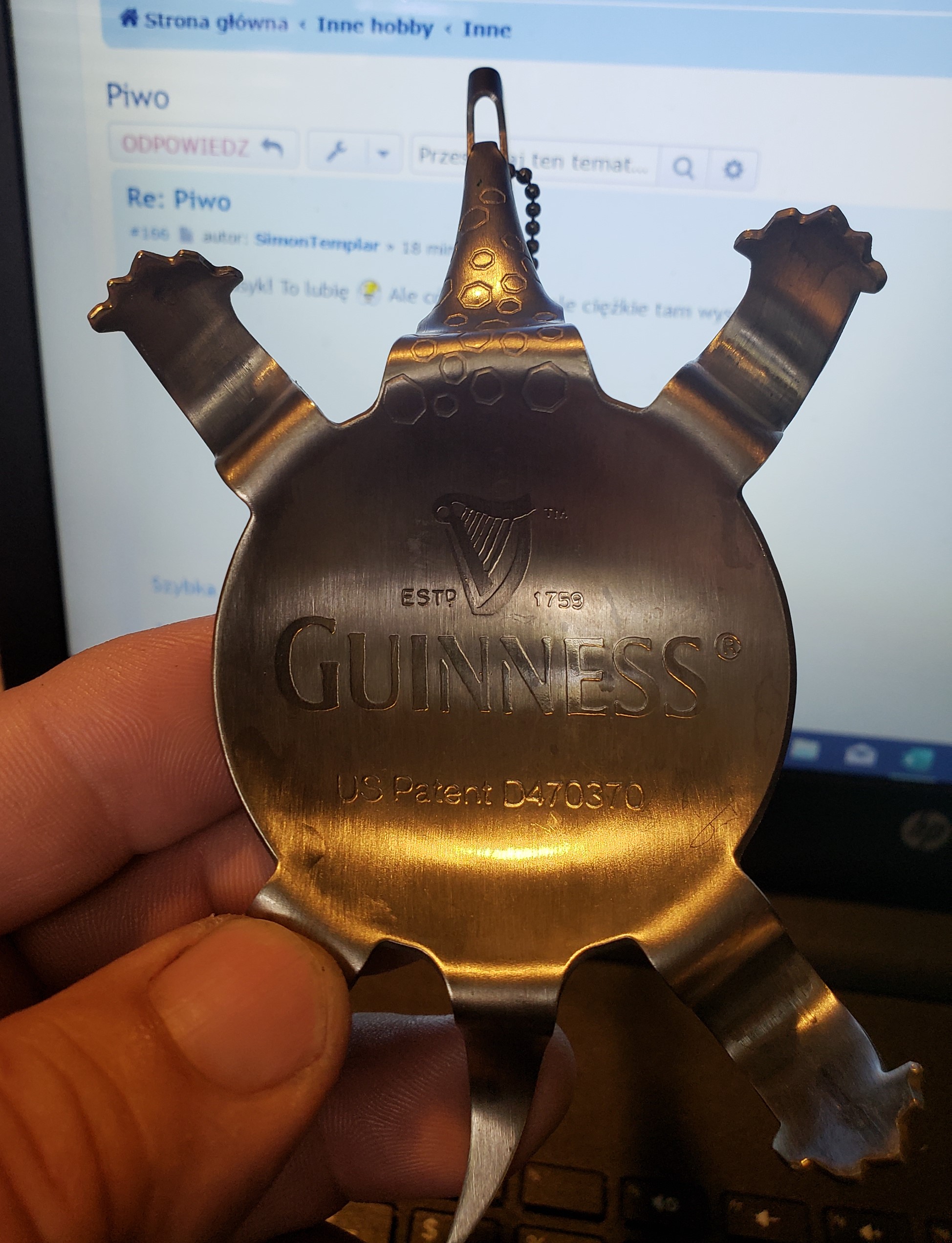 Zgadza się jest to separator tzn "pouring spoon". Używa się tego w ten sposób że wlewamy do szklanki gęste ciemne piwo , kładziemy żłówika na szklankę i po jego plecach lejemy jasne lekkie piwo. Ponieważ piwa mają różną gęstość to przez jakiś czas się nie mieszają i otrzymujemy dwukolorowy trunek. A ostry ogonek używa się do robienia dziurki w puszce żeby piwo się lepiej wylewało.