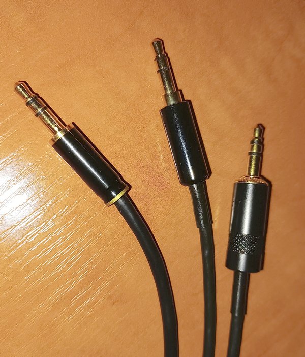Ten z lewej jest fajny, bo solidny metalowy o średnicy 5,5 albo 6 mm (nie mam sówmiarki pod ręką). Środkowy ma takie poddtoczenie, które pasuje mi do słuchawek Sony MDR-1A. Przewody opisane jako: