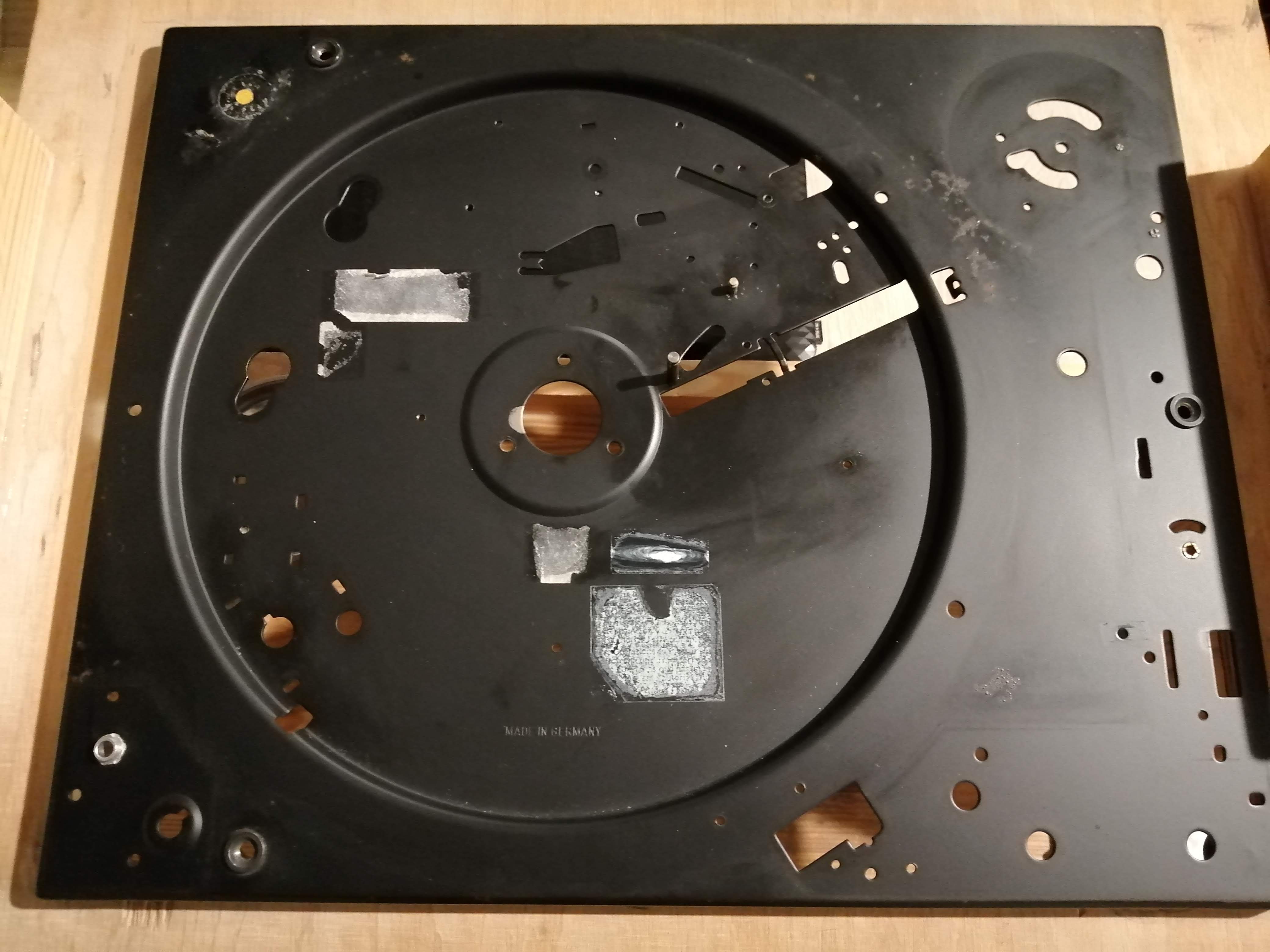 Plintę wykorzystałem od modelu 504 bo chciałem, aby była czarna i pasowała do koloru czerwonego. Sama obudowa też została odświeżona i przemalowana. Musiałem też przykleić matę do talerza bo była już odseparowana. Antyrezonator w przeciwwadze naprawiony. Egzemplarz ten otrzymał też nową dedykowaną ledową lampkę do stroboskopu od Dualfreda. Poza tym nowe okablowanie. Wymienione elektrolity na płytce elektroniki silnika i w zasilaniu. Pokrywa miała być dorabiana ale ostatecznie jest oryginalna po polerce. Oryginalne naklejki wróciły na swoje miejsce. Także podsumowując trochę pracy i środków zostało w ten model włożonych. Nie ukrywam, że trochę dla "funu" i sportu