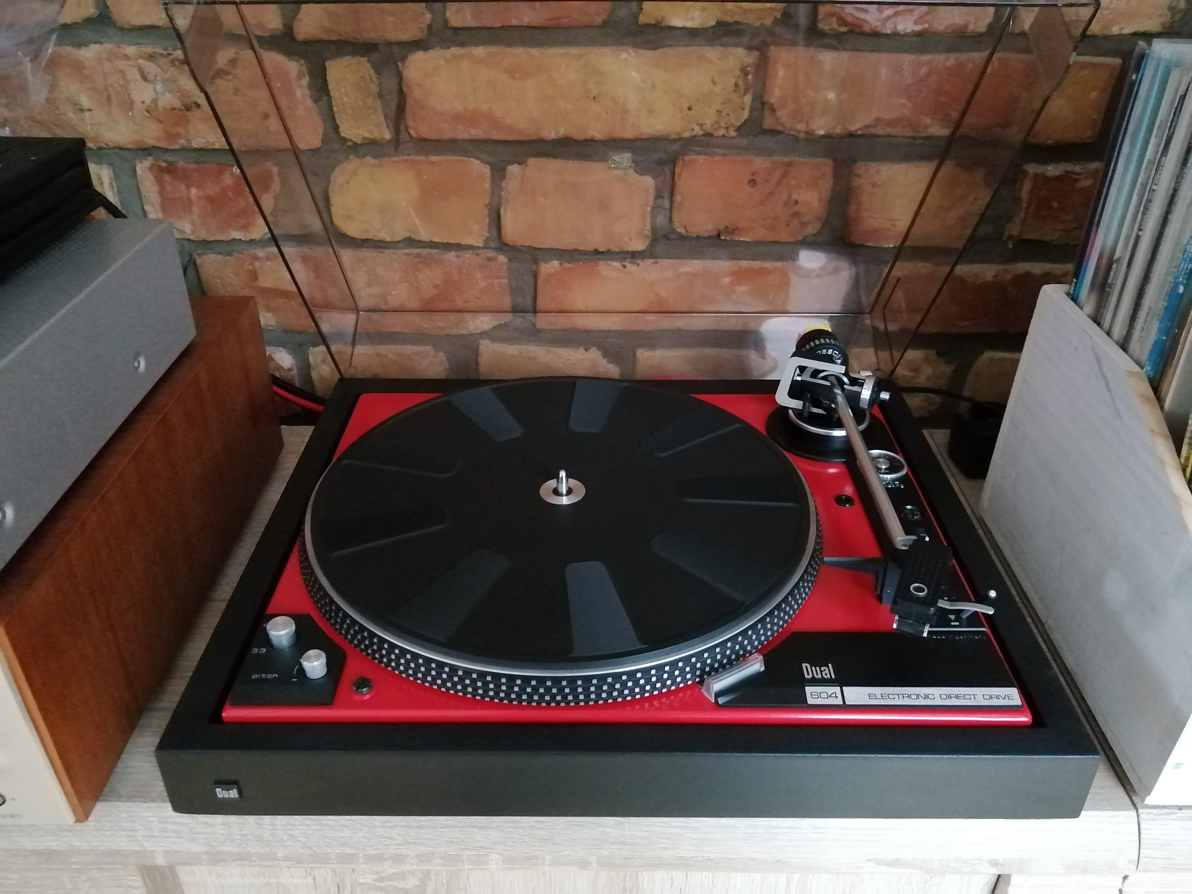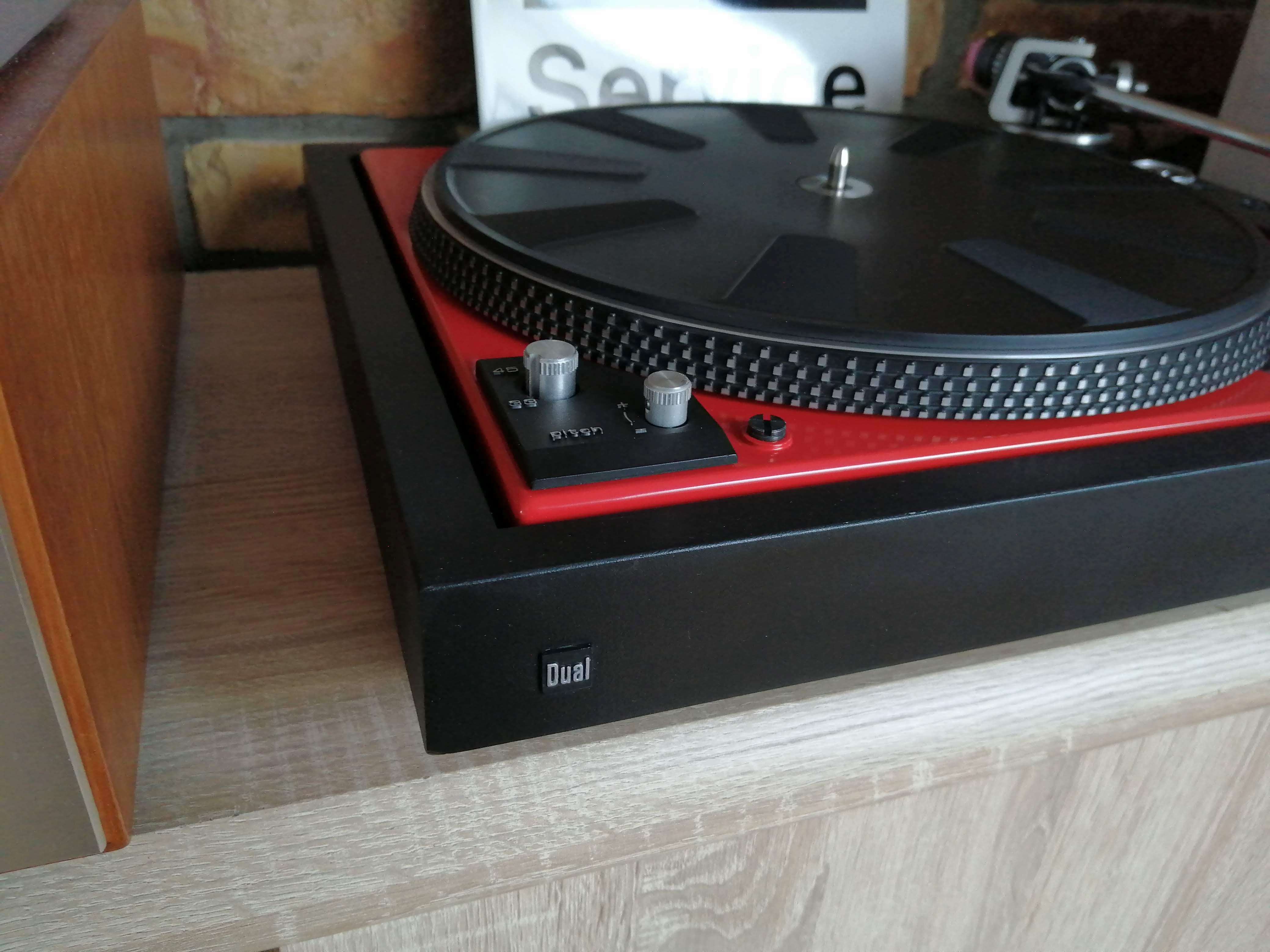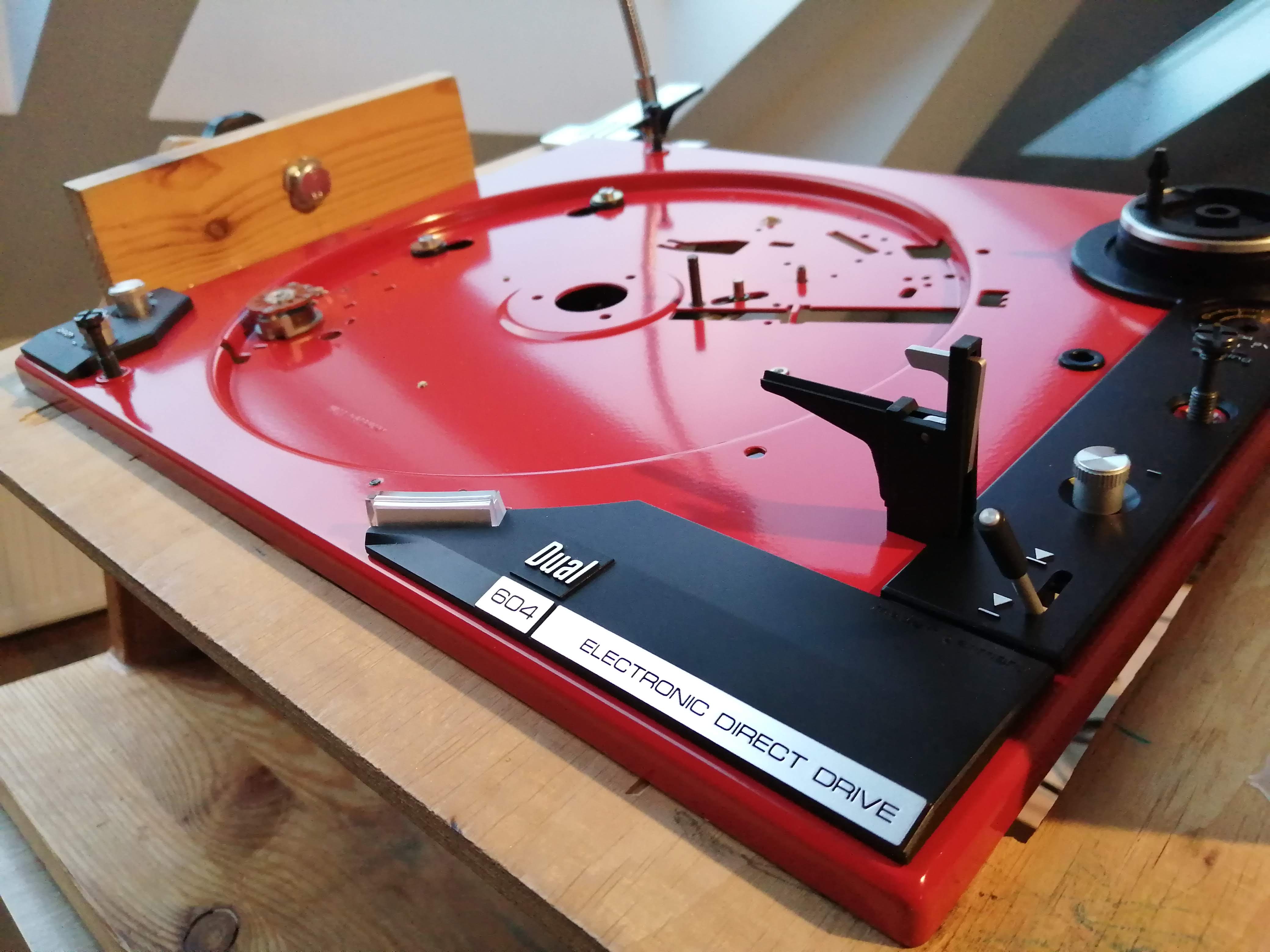 Ok projekt zakończony. Gramofon to Dual 604 przemalowany na kolor czerwony z z powodu wykwitów rdzy na oryginalnym lakierze. Korzystając z okazji, że był cały rozebrany to wszystkie plastikowe zaślepki wymyłem w wodzie z płynem i potraktowałem preparatem do plastików.