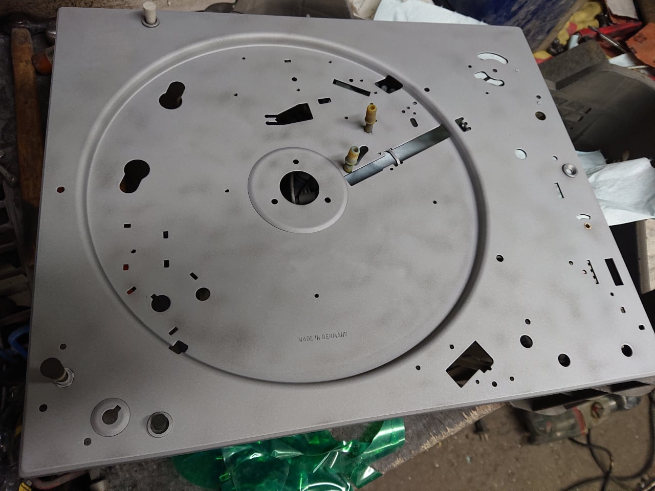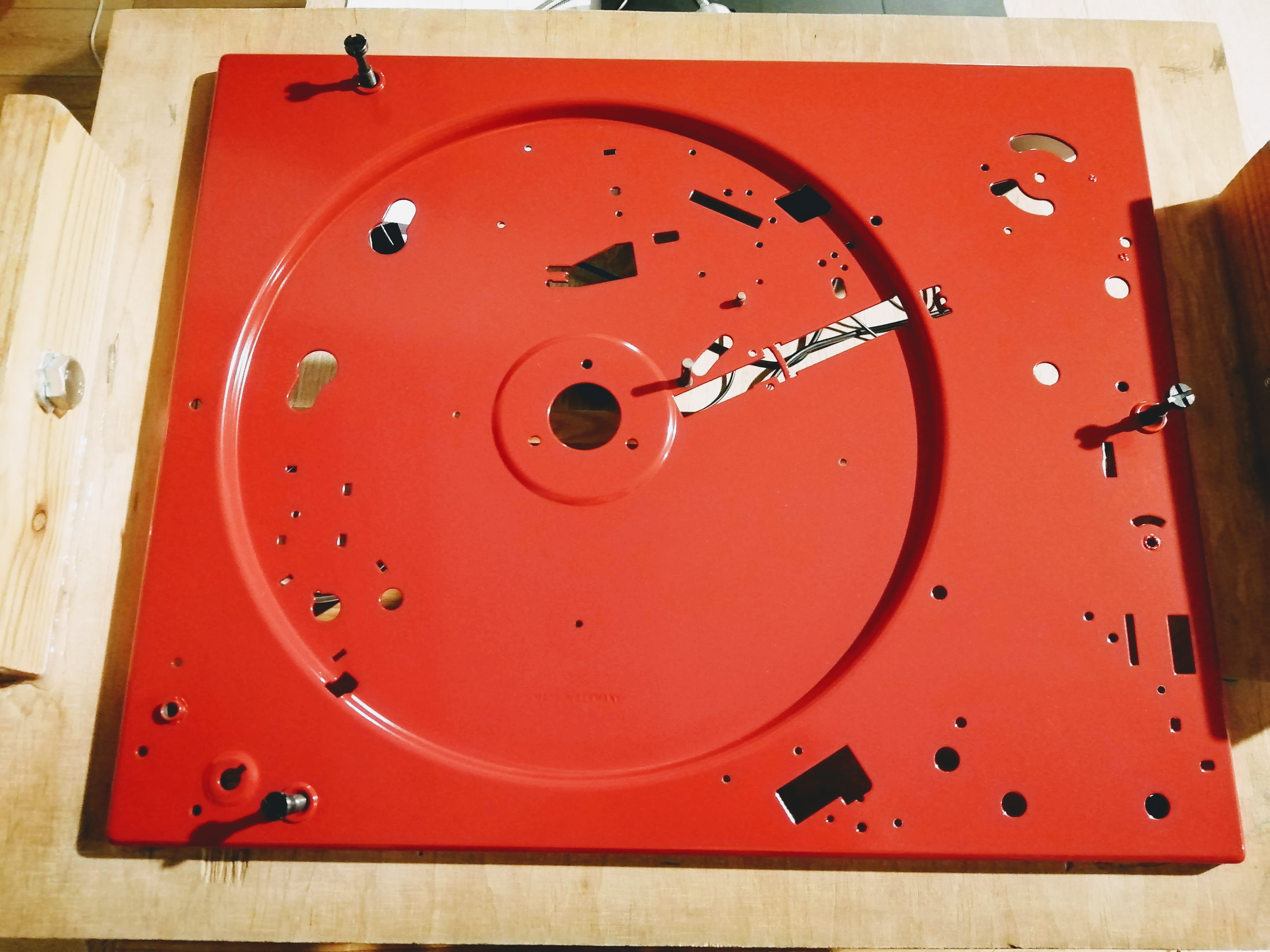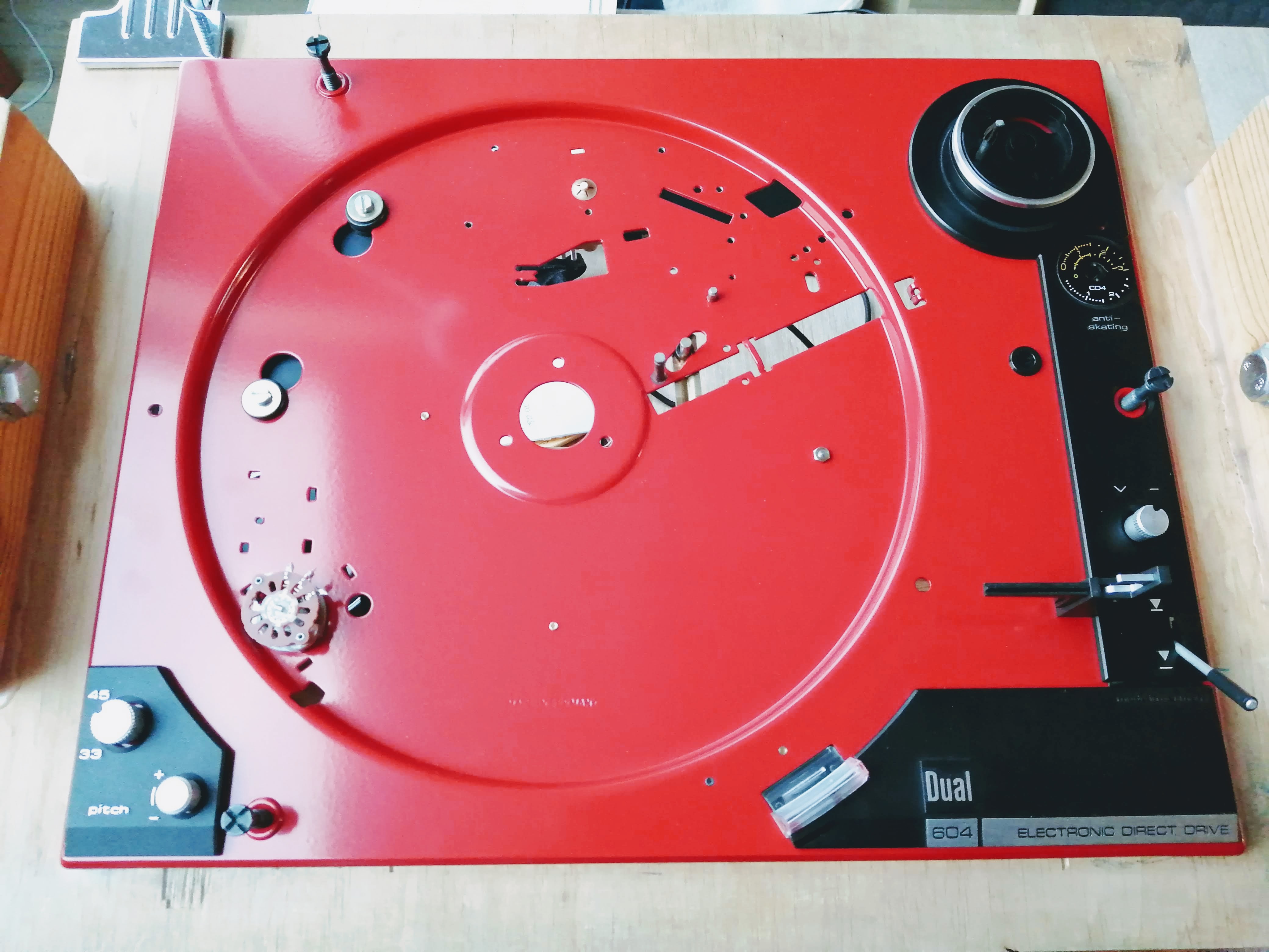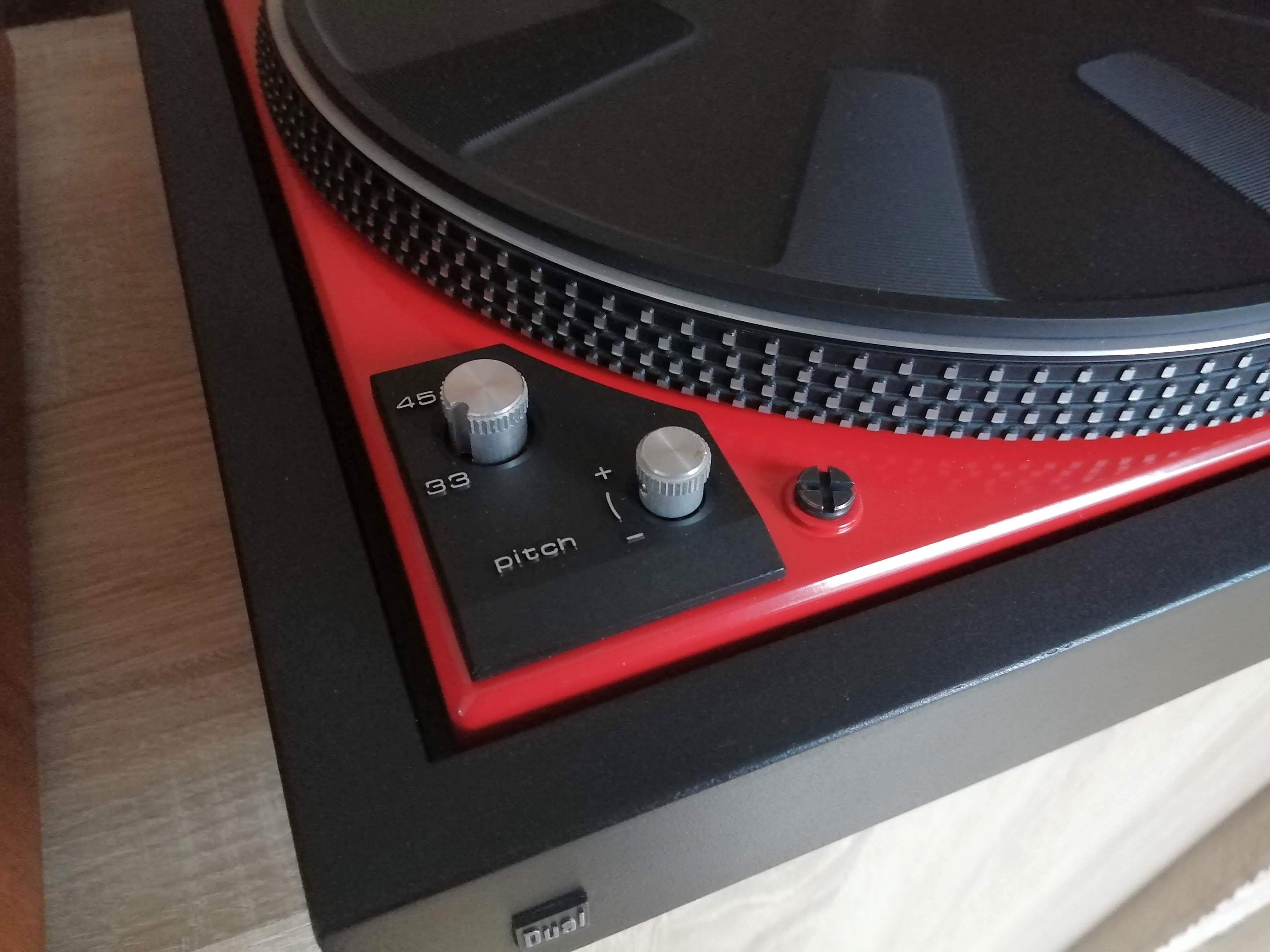 Ok projekt zakończony. Gramofon to Dual 604 przemalowany na kolor czerwony z z powodu wykwitów rdzy na oryginalnym lakierze. Korzystając z okazji, że był cały rozebrany to wszystkie plastikowe zaślepki wymyłem w wodzie z płynem i potraktowałem preparatem do plastików.