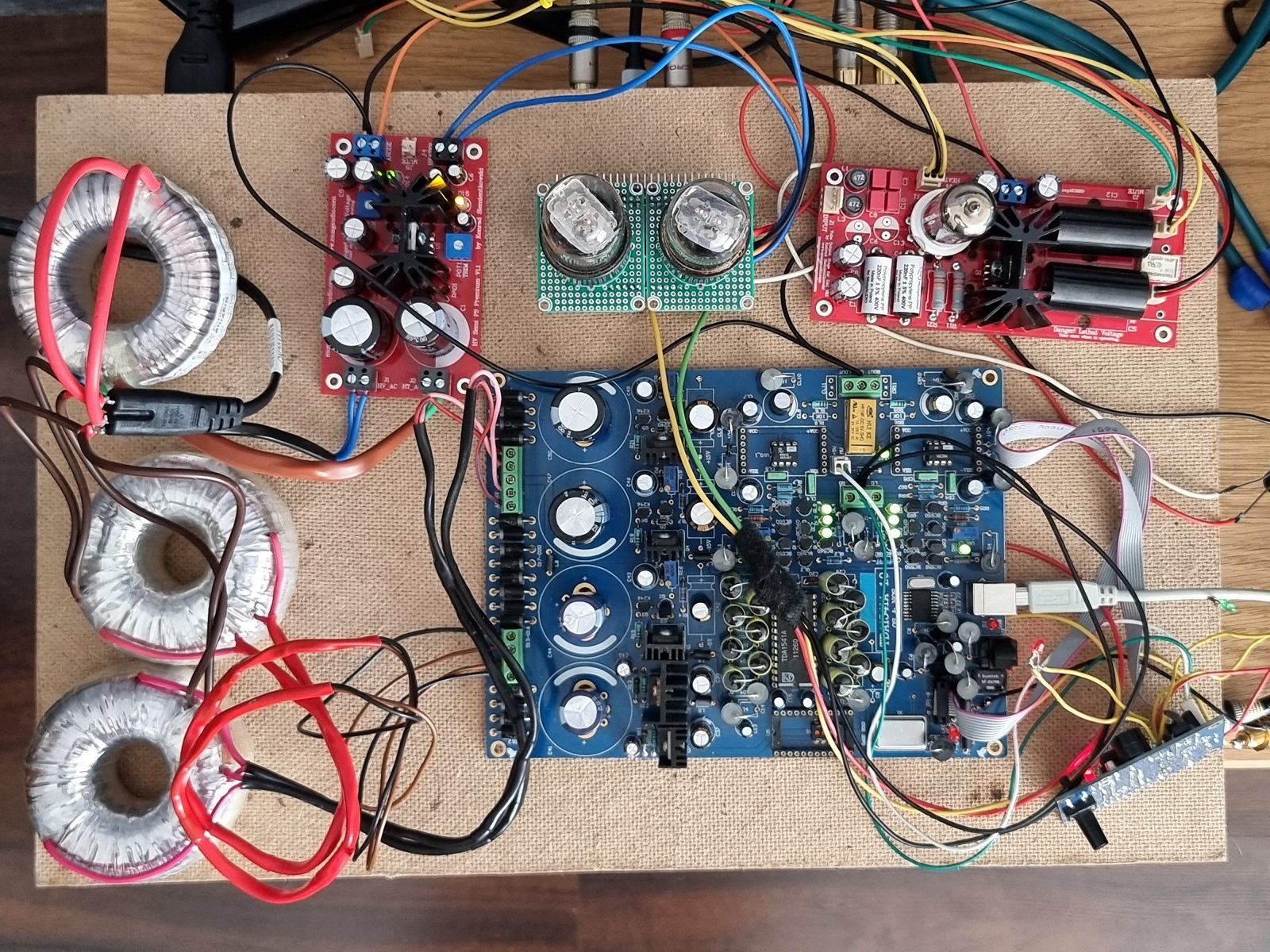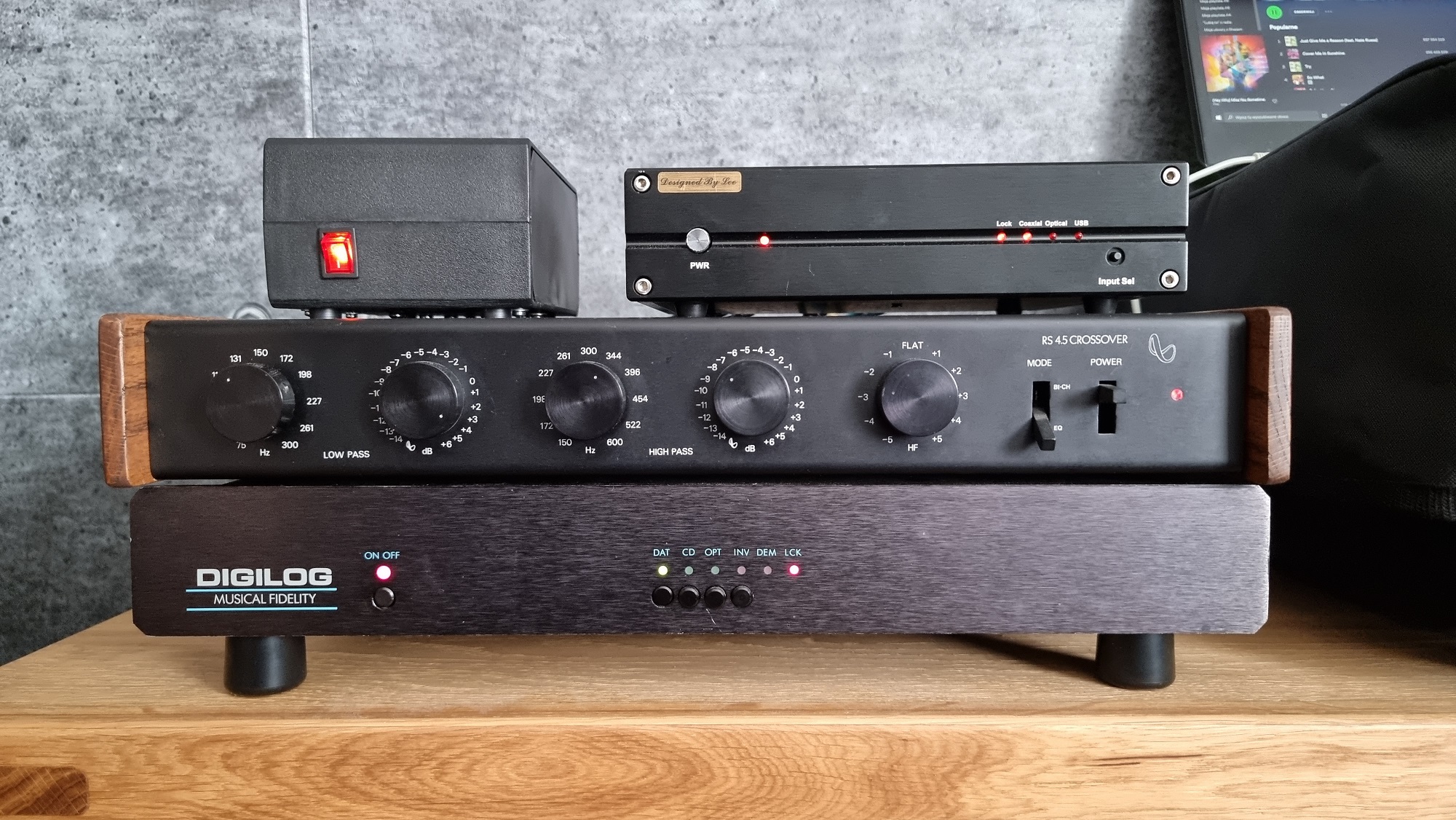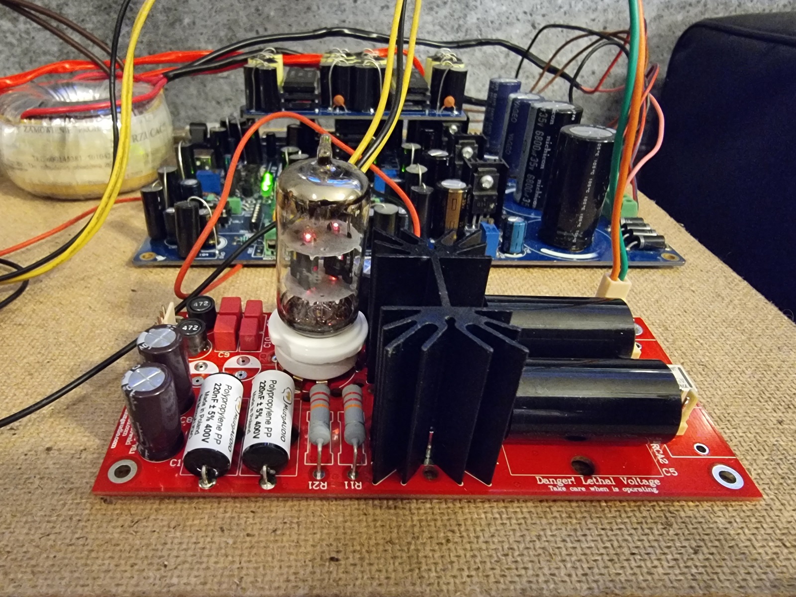Skoro robimy bez kompromisu to w torze zasilania pojawiły się trzy wydajne toroidy: pierwszy to 2 x 18 V, drugi to 2 x 9 V oraz trzeci do układów lampowych z symetryzowanym żarzeniem i mocnym anodowym. To trzecie trafo jest bardzo ważne bo zasila dwa układy jednocześnie. Zasilamy więc ECC81, MOSFET''a i 2 x 6N9S. Oprócz większego niż zazwyczaj trafa pojawił się również zasilacz Muzg Audio w wersji Premium. Konrad zaleca do zasilania swojego układu 300V anodowego, Reflector'y przy tym napięciu też pracują bardzo dobrze, potrzebne więc było podniesienie potencjału grzania a zasilacz w wersji Premium dzwiga potencjał wraz ze wzrostem zasilania. Drugą sprawą jest to, że NOS Telefunken'a kosztuje mały majątek więc zalecana jest jego ochrona poprzez narastanie napięcia grzania, opóźnienie załączania napięcia anodowego po grzałkach oraz ochrona przed zanikiem zasilania, wszystko to realizuje również ten zasilacz. Całość podłaczona do próbnego odsłuchu: