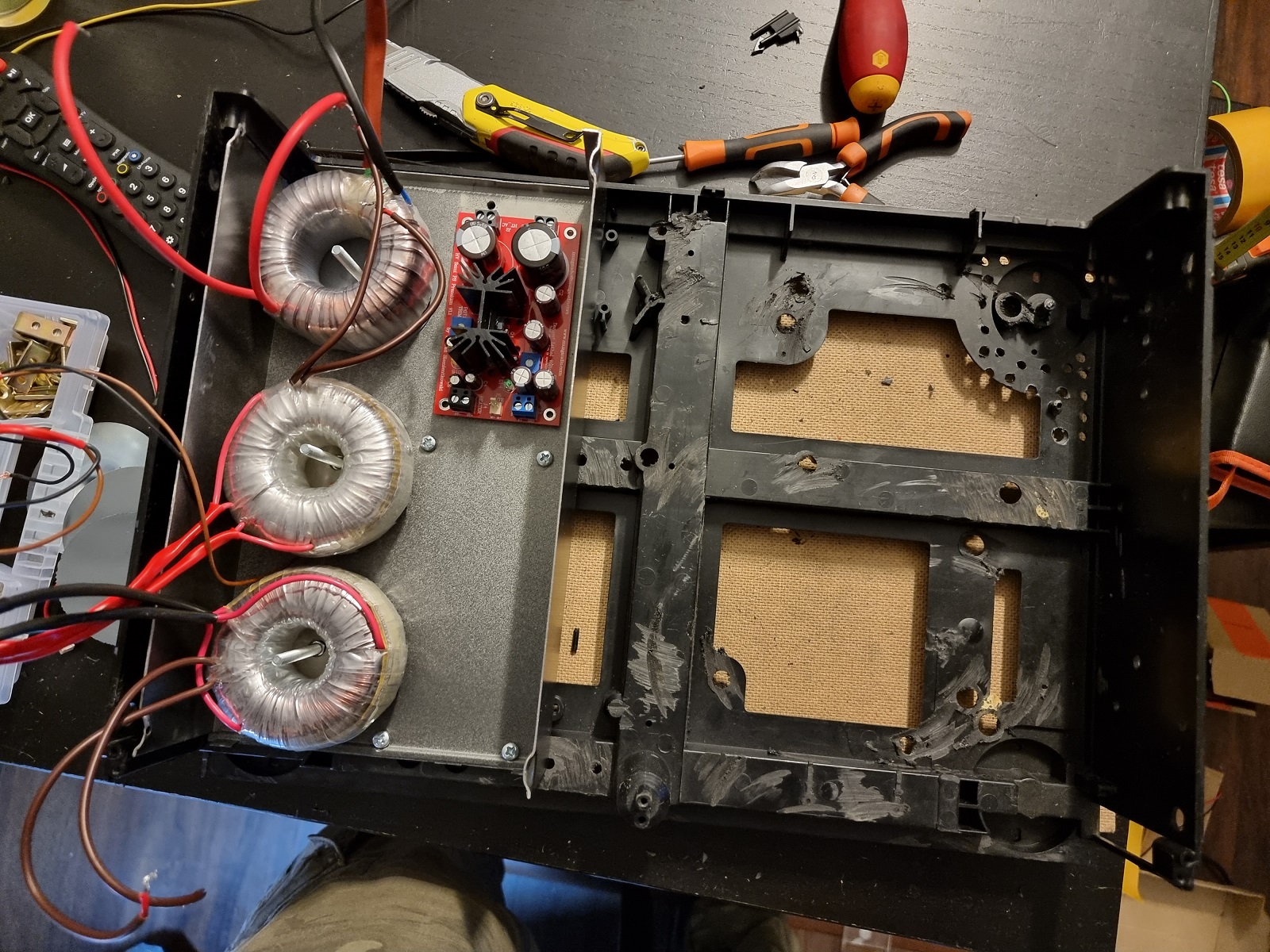 i pozostałe 2/3 obudowy zajęła taka sama wyprofilowana blaszana "tacka" , która pomieściła zarówno PCB, i selektor wyjść, jak i oba układy analogowe :
