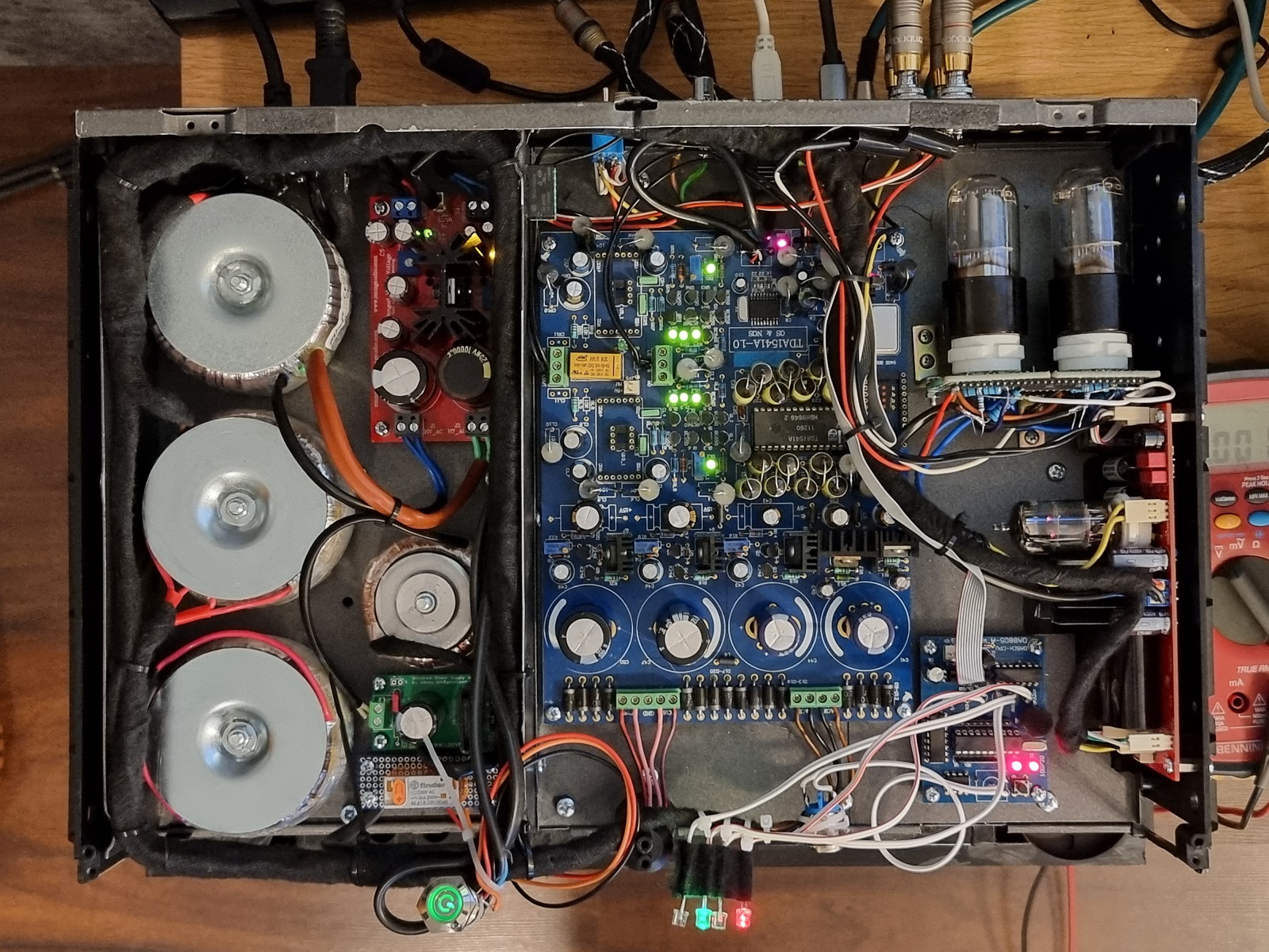 Pojawiły się również jak widać diody sygnalizujące wejścia i ich aktywność, jest też włącznik który doczekał się osobnego układu w sekcji zasilania. Jak sie bawić to na całego. Układ ten poprzez małe trafo stale zasila podświetlanie przycisku power na czerwono a po włączeniu urządenia przekaźnik zmienia wejście na włącznik i mamy podswietlenie na zielono. Oczywiście włącznik oprócz zmiany koloru załącza napięcie na pozostałe trafa.
