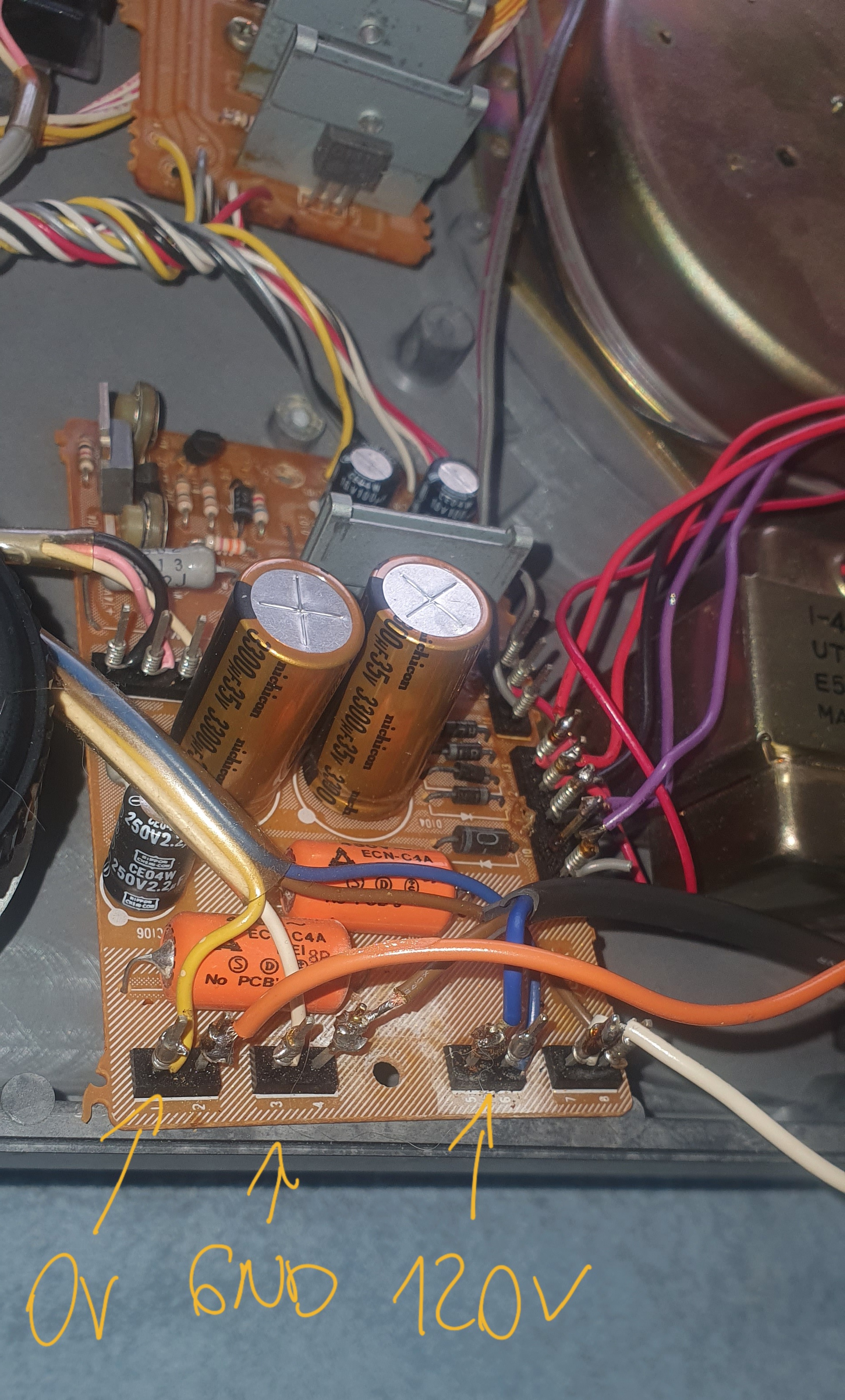 Pacjent jest na stole, jako że elektronik ze mnie żaden i tylko potrafię zbadać napięcie w gniazdkach, zabrałem się na początek za pomiar kabla na płytce i tu wydaje się być ok. Napięcie 120v idzie do trafa teraz tylko powiedzcie co zmierzyć:)