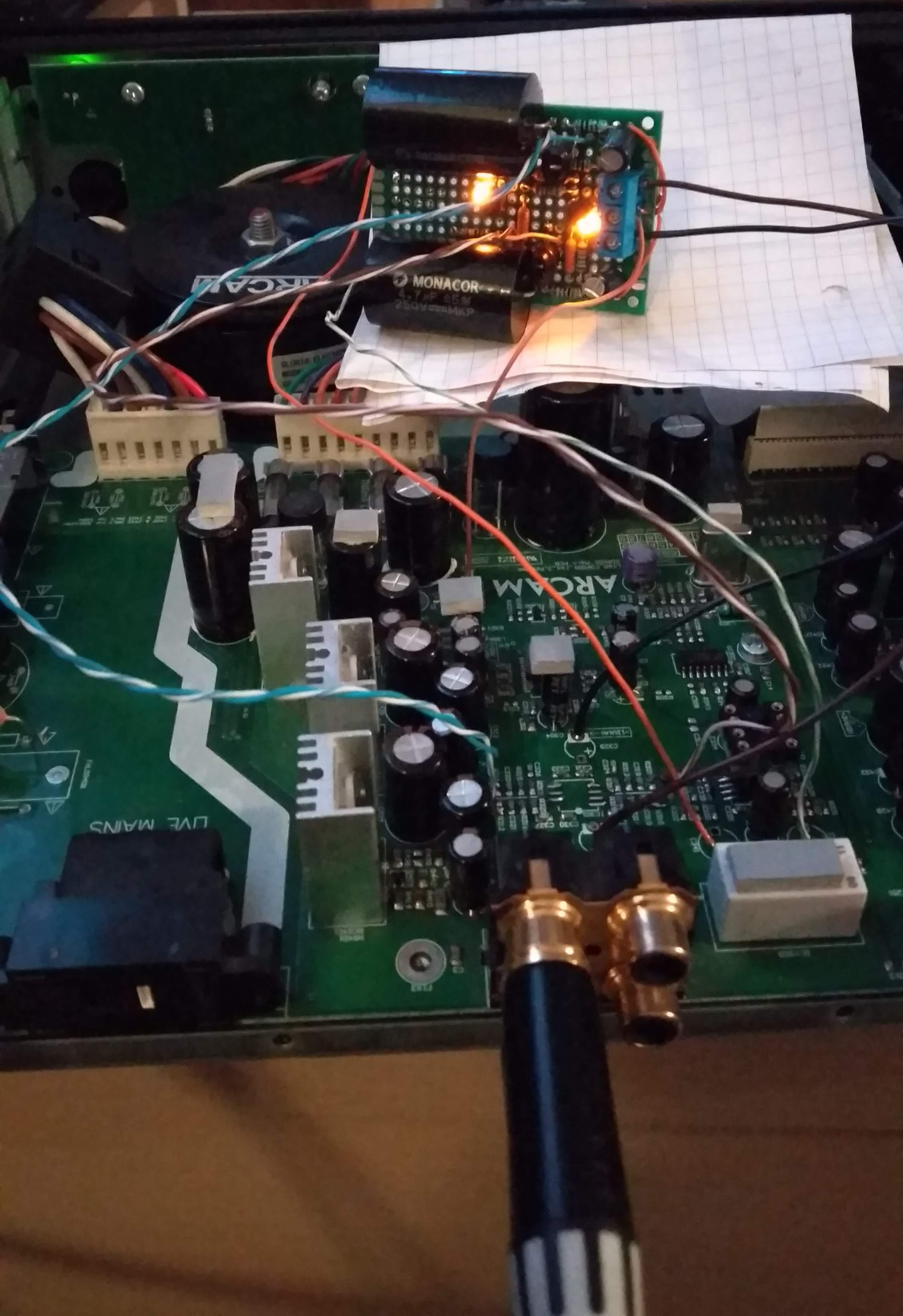 Ukradłem sygnał i prąd z płyty głównej CeDeka: Nie ruszyło od kopnięcia, bo w schemacie miałem błąd ale po poprawieniu diody źródeł prądowych ładnie zabłysły i ze słuchawek (bo późno) popłynęła MUZYKA! Chyba jest dobrze, bo słuchanie CD nie wywołuje już ochoty na jak najszybsze znalezienie odpowiedniego winyla
