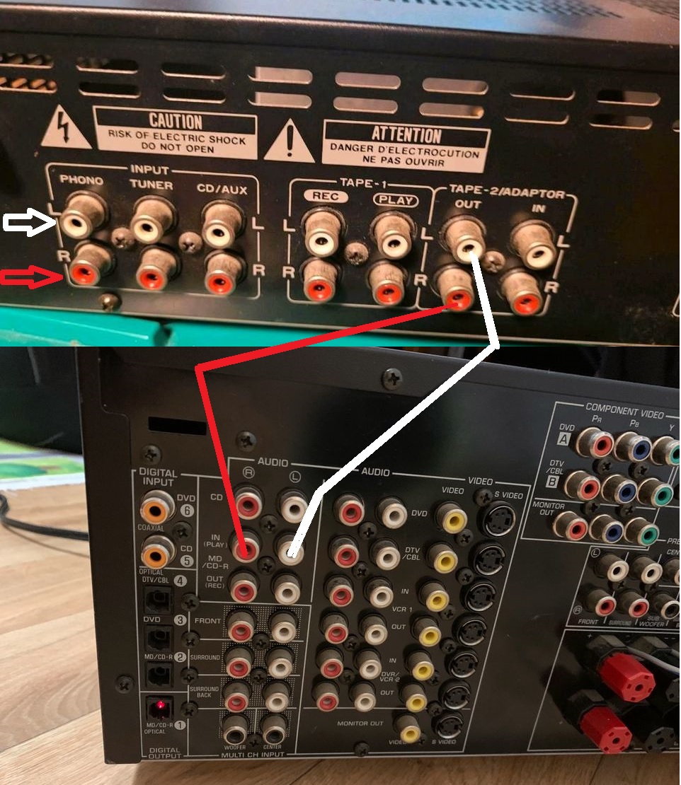 W instrukcji amplitunera Yamaha jest opis podłączenia do niego innego wzmacniacza. Nie jestem jednak przekonany czy to sprawdzi sie w mojej sytuacji. Nie chce też niczego uszkodzić. Nie chcę zwiększać mocy jak jest napisane w instrukcji. Chcę tylko wykorzystać wzmacniacz jako brakujące wejście Phono. (dolne zdjęcie zapożyczone z neta)