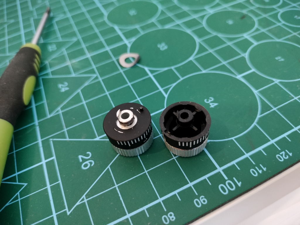 Co jest tutaj bardzo ważne to te dwie wypustki, które są szalenie istotne dla funkcjonalności. Jeżeli się wyłamią czy zetrą, to całe pokrętło jest do wyrzucenia. W tym pokrętle wykonanym z plastiku jest niestety na to dość spora szansa. W tym z aluminium nikła.
