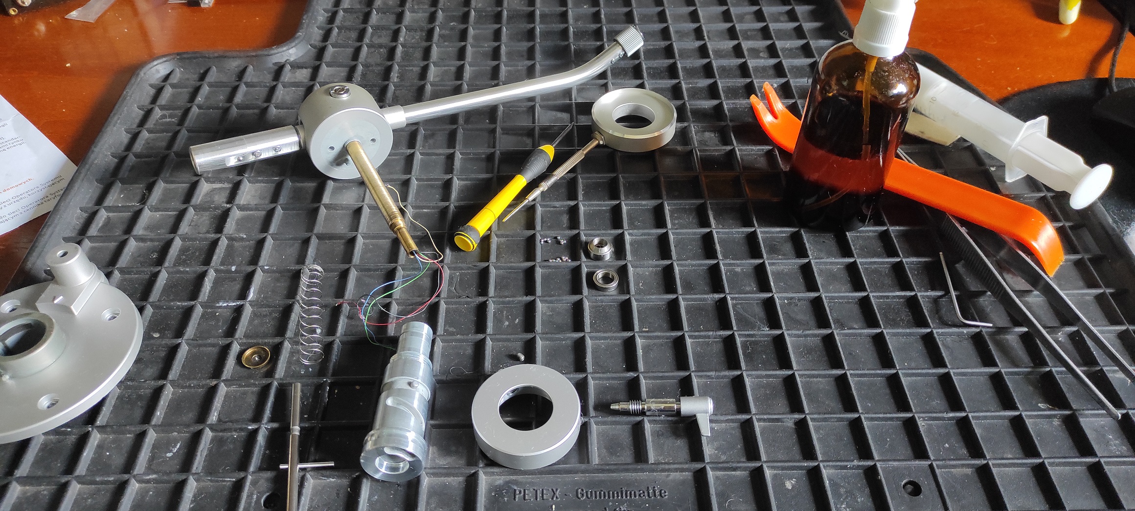Wymyłem też zaoliwione dolne łożysko ramienia, bo jakimś cudem mimo kleju ze smaru było też dużo oleju, zbędnego. Ale chyba miał służyć rozruszaniu tego sprzętu bez czyszczenia.