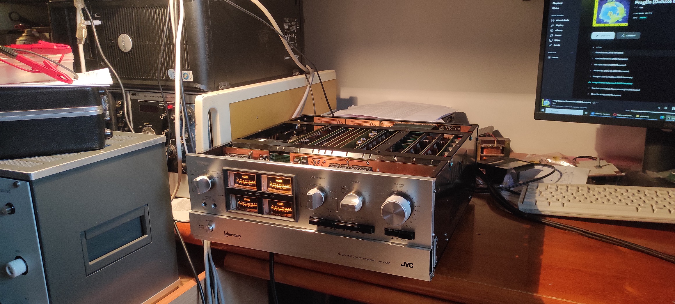 Wreszcie wysłałem też do domu JVC JP-V1000 kwadrofoniczny przedwzmacniacz który cierpiał na przydźwięki sieciowe. Zwalczyłem problem, sprawa była trudna, zrobiłem przy okazji trochę sprzętu pomiarowego potrzebnego do badań. To była robota na poziomie akademickim, myślę pracę inżynierską bez najmniejszego kłopotu przy okazji bym napisał i obronił. Całość z cyklu "dam radę zrobić" co by pokazać, że jak inni nie potrafią to ja zrobię, pal sześć, że stawka godzinowa w obsłudze publicznego szaletu wyszła by mi pod koniec tej walki lepsza gdybym był klozetowym. Ważne, że klient zadowolony i może spać bo go ten problem martwił ;-) A na serio to cieszy mnie jak wychodzi dobrze jakaś trudna sprawa.