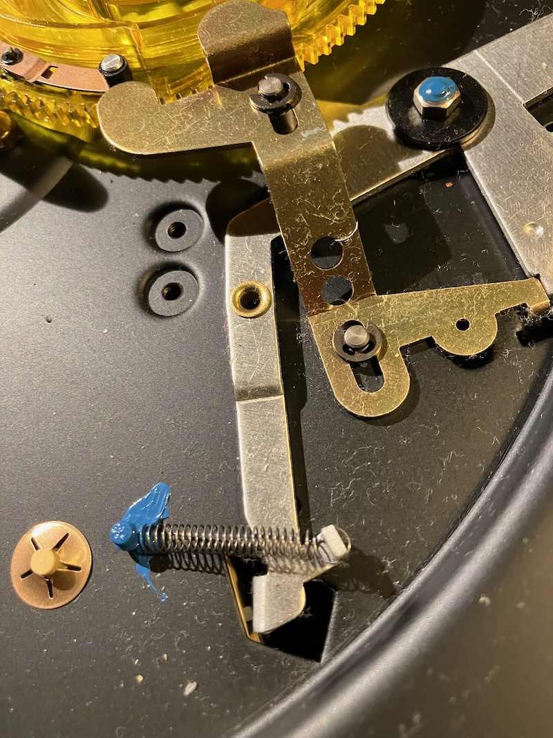 Usunąłem zwłoki starego steuerimpla, położyłem trochę smaru do tworzyw na sztyft chodzący po kole (ten co całą logiką zarządza). Reszta – smary zostawiam oryginalne, nawet nie zjełczałe. Przeczyściłem styki we wszystkich przełącznikach kontaktem. Co tam syfiło to wymyłem izopropanolem.