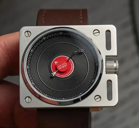Nowy zegarek marki AndoAndoAndo, Vinyl Record Automatic Watch, wygląda jak mały gramofon przypięty paskiem do nadgarstka...