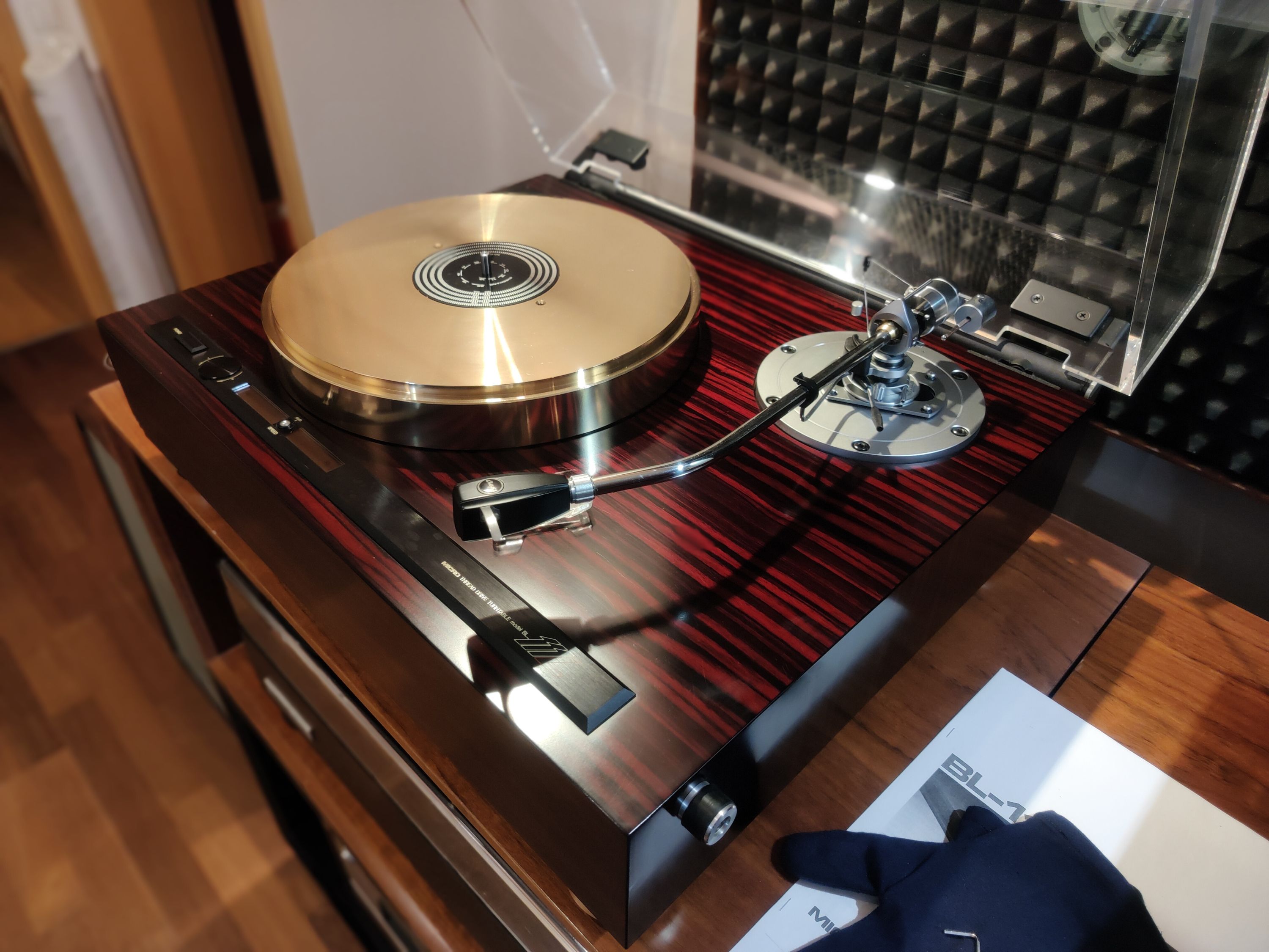 Przez bardzo długi czas zabiegałem o ten gramofon. Micro Seiki BL 111L. Jest on pierwszy w tej wersji choć wcześniej już miałem do czynienia z kilkoma BL 111. Różnica między BL 111L a BL 111 to przystosowanie do montażu różnej długości ramion. BL 111 to 9-10" a BL 111L jest przystosowany do długich 12" ramion. Łożysko i napęd w obu przypadkach jest takie samo. Piękny egzemplarz lecz w transporcie doznał bardzo niewielkiego uszkodzenia obudowy. To niestety strasznie boli. Jednak pierwsze dźwięki z płyty rekompensują straty