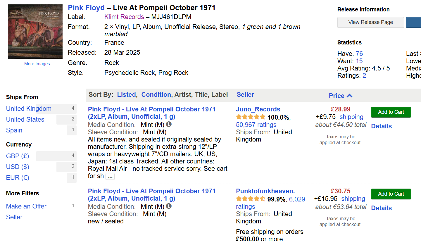 grazio pisze: ↑28 lip 2025, 09:29To chyba to:Don55 pisze: ↑27 lip 2025, 21:38Pink Floyd Live At Pompeii, October 1971 2LP za 95 PLN