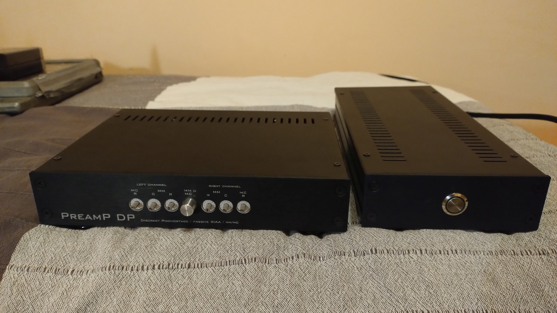 Powstał jeszcze jeden PreamP na wypasie. Znowu obudowy z modushop.pl, dodany napis na froncie. Porządne złącza RCA od CMC. Prezentuje się zawodowo: