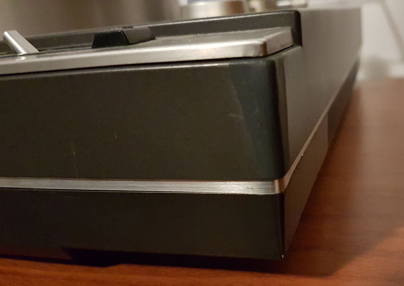 Kupiłem biedaka z opisem: nie działa silnik i podświetlenie stroboskopu, brak przeciwwagi, ramię nie opuszcza się, brak headshell i wkładki, zniszczona plinta, uszkodzona wtyczka RCA itp.