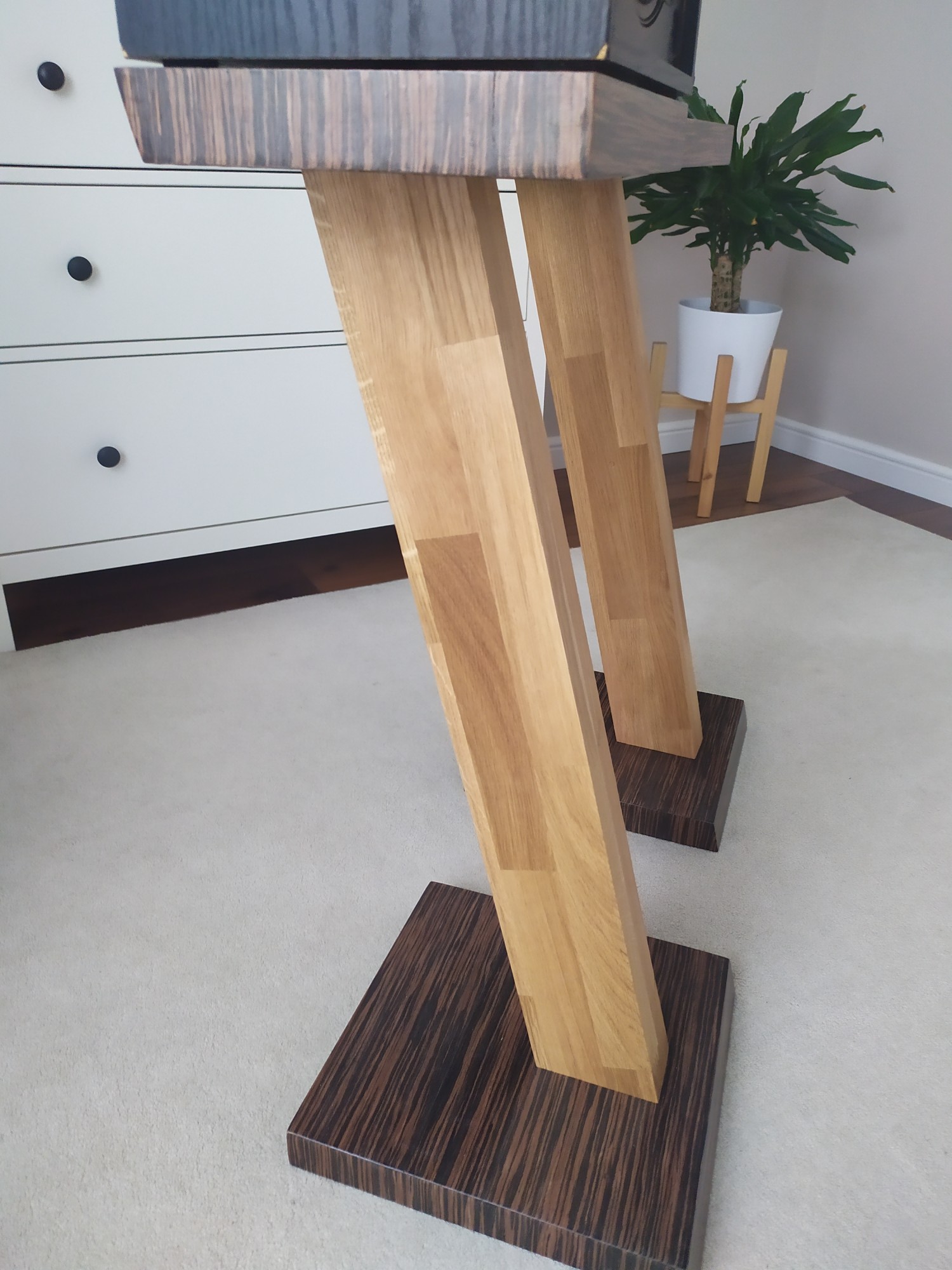 Dolna i górna półka to MDF 40mm pokryty modyfikowanym fornirem (Heban) plus lakier akrylowy. Do tego długie i grube wkręty. Jeszcze będą toczone nóżki/ kolce z nierdzewki, ale to w późniejszym czasie.