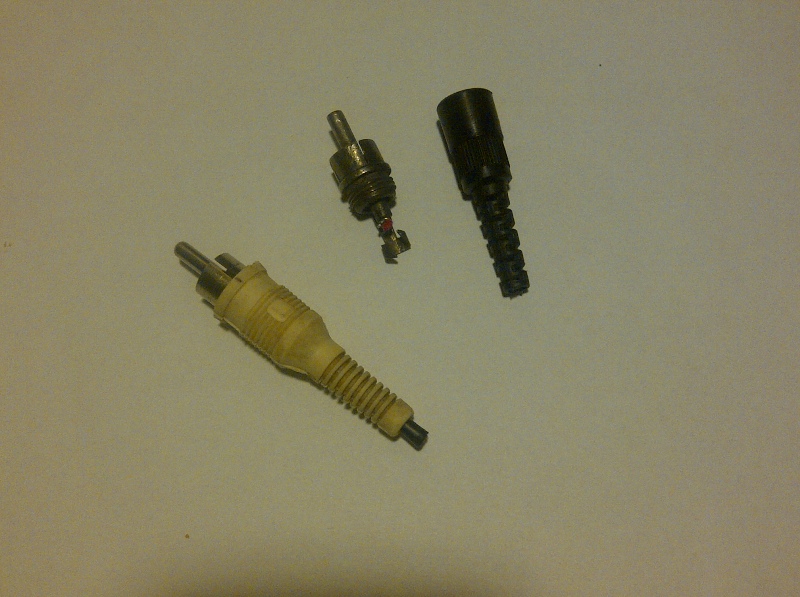 -od czasu do czasu zdarzało mu się poburczeć, lecz po wielu odsłuchaniach udało mi się znaleźć problem, a wyglądał on tak: -postanowiłem coś z tym zrobić i oto efekt: Nie wiem, czy takie wtyki są jakieś super, ale stwierdziłem, że wstawianie lepszych przy starym kablu byłoby przerostem formy nad treścią. O dziwo wtyki w sklepie kupiłem taniej niżeli w internecie- na allegro ceny ok 8zł